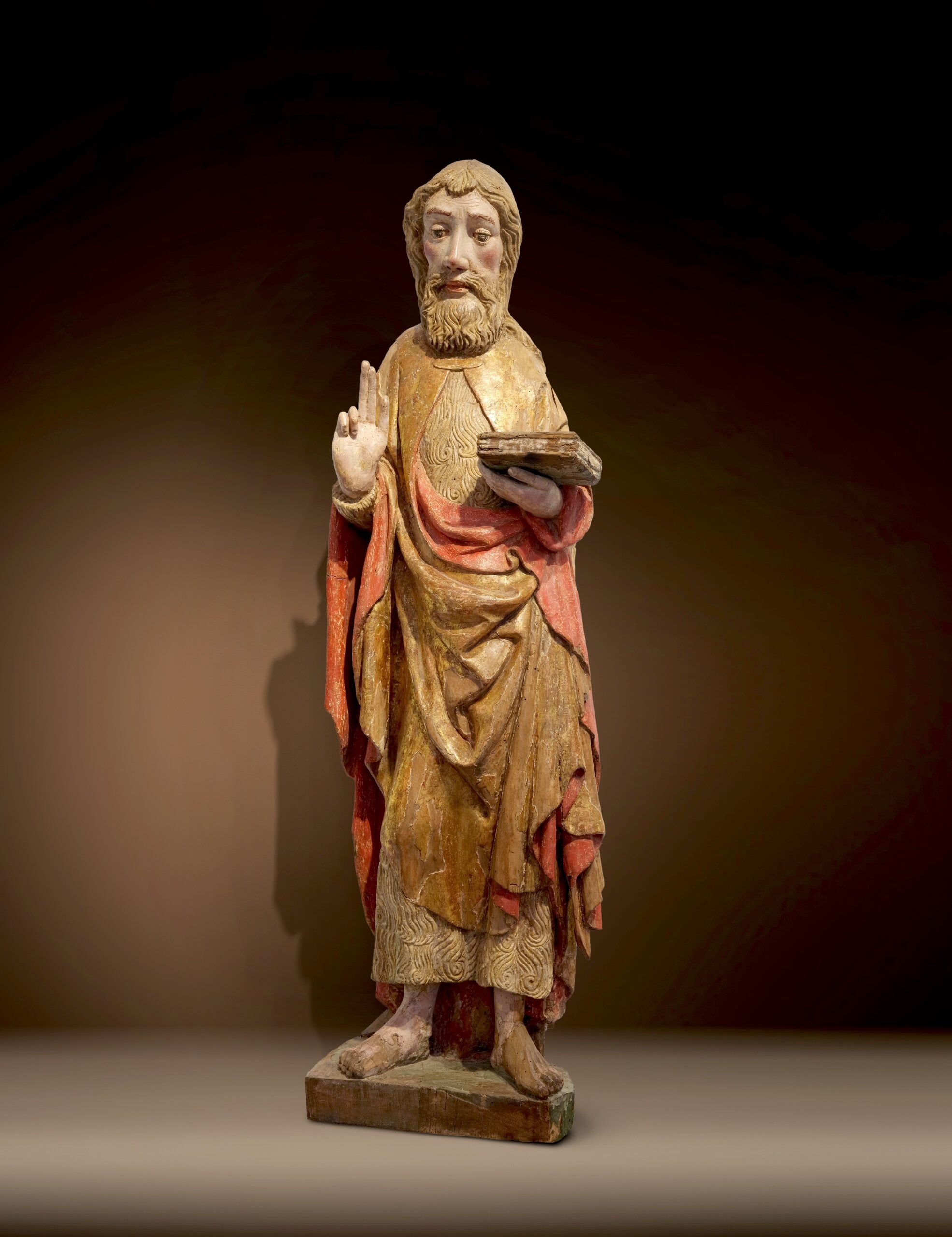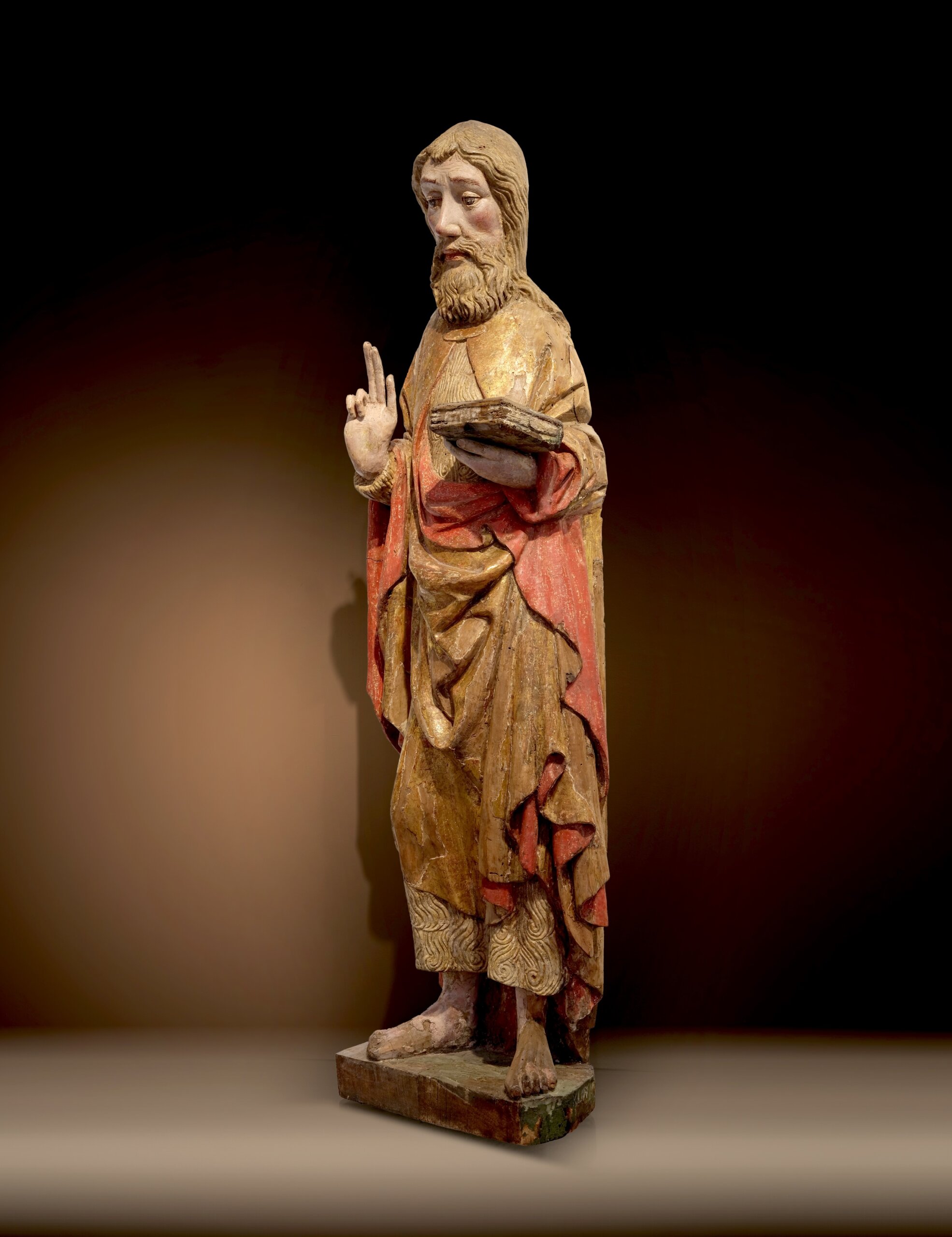 Johannes erscheint hier als erhabener Bußprediger, ausgestattet mit seinen typischen Attributen: Das Gewand aus Kamelhaar – Sinnbild der asketischen Lebensweise – ist mit erstaunlicher Feinheit geschnitzt. Das Haar ist annähernd symmetrisch gelockt und dadurch herzförmig angeordnet. Darüber liegt ein goldener, mit rotem Futter ausgeschlagener Mantel, der mit einer Brosche zusammengehalten ist und in seiner Pracht einen spannungsvollen Kontrast zur einfachen Lebensweise des Heiligen bildet. Barfuß steht der Heilige auf der Bodenplatte – eine betonte Erdung, die auf seine Wüstenexistenz verweist. Die sehnigen Füße mit gelängten Zehen weisen nochmals auf seine Askese hin. In der linken Hand trägt er ein Buch, vermutlich die Heilige Schrift, als Zeichen seiner Rolle als Prediger. Die rechte Hand ist im klassischen Verkündigungsgestus erhoben: Mittel- und Zeigefinger sowie der Daumen zeigen nach oben, ein sprechender Ausdruck seiner prophetischen Mission. Die langgliedrigen Finger zeigen naturalistisch ausgeformte Fingernägel sowie Kerbungen an der Handfläche, wodurch die Figur einen nahbaren Eindruck vermittelt.