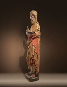 Besonders bemerkenswert ist das plastisch fein gearbeitete Haupt- und Barthaar, das dicht, symmetrisch herabfallend mit einer auffälligen, einzelnen Stirnlocke geschnitzt wurde; ein charakteristisches Merkmal, das sich ebenfalls bei der Darstellung des heiligen Veit in der Kreuzkapelle von Karlstein findet. Diese Parallelen zur Theoderich-Werkstatt – sowohl im Haarstil als auch in der naturalistischen Gesichtsgestaltung – sprechen für eine stilistische Nähe zu diesem Künstlerkreis. Die Gesichtszüge von Johannes sind äußerst lebendig modelliert: Gerötete Wangen und wache Augen mit prominenten, hochgezogenen Brauen verleihen der Figur eine dialogische Präsenz. Sein Blick scheint sich an einen tieferstehenden Betrachter zu richten – wohl ein Hinweis auf die einstige Aufstellung in erhöhter Position, vermutlich innerhalb eines Altars oder größeren Raumgefüges einer Kirche.