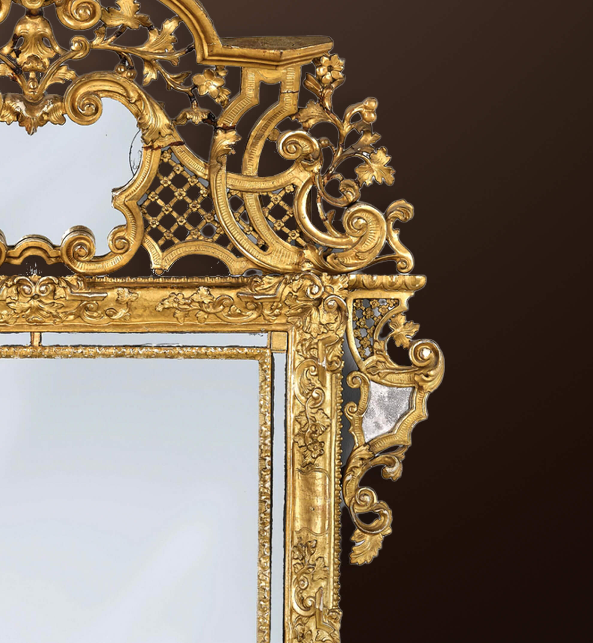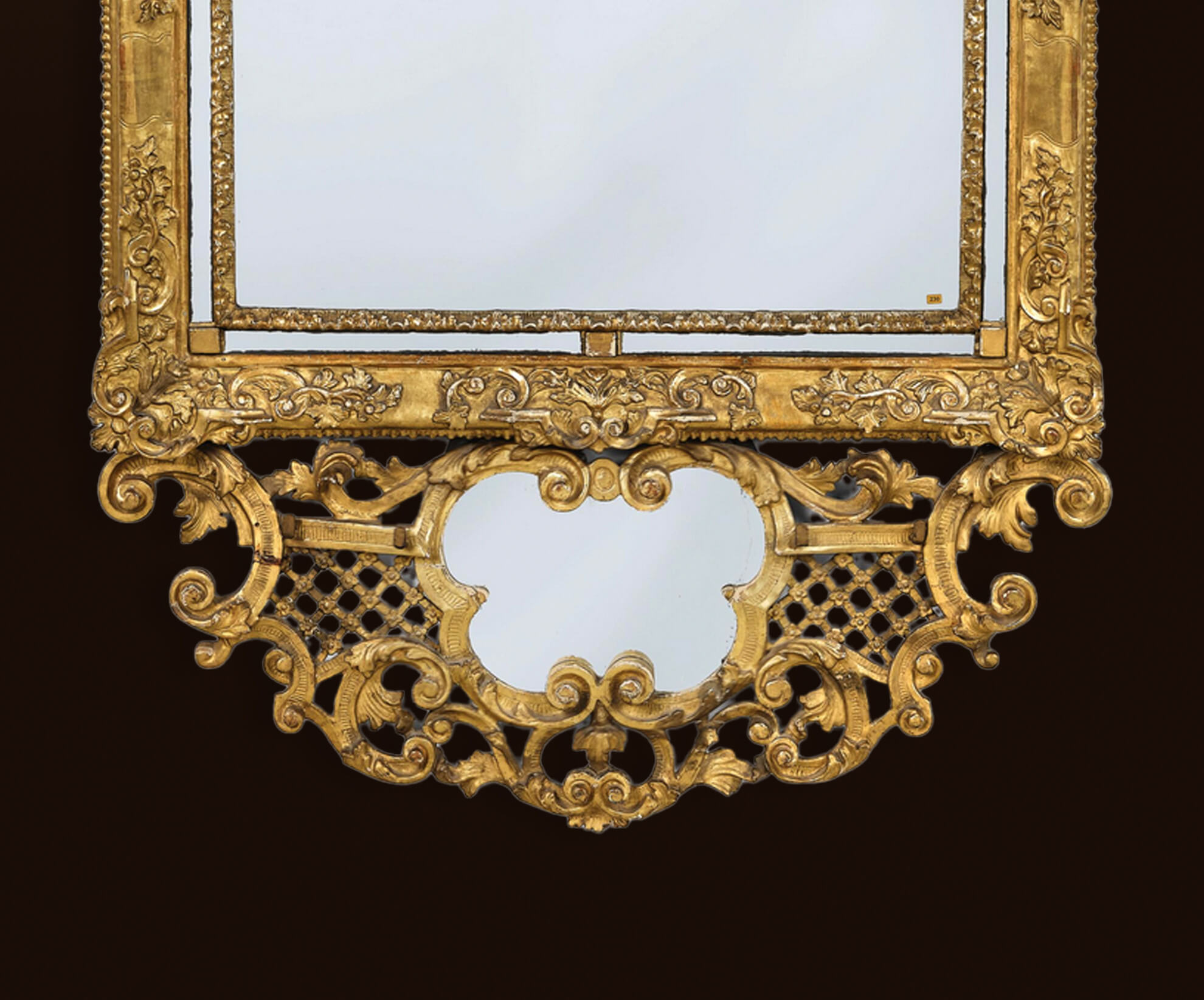 lattice decoration. Cartouche-shaped finial with