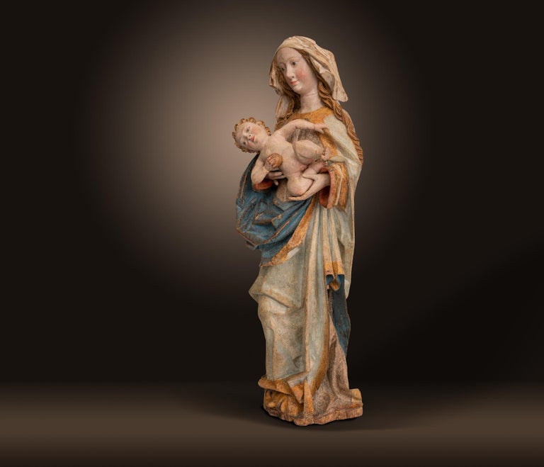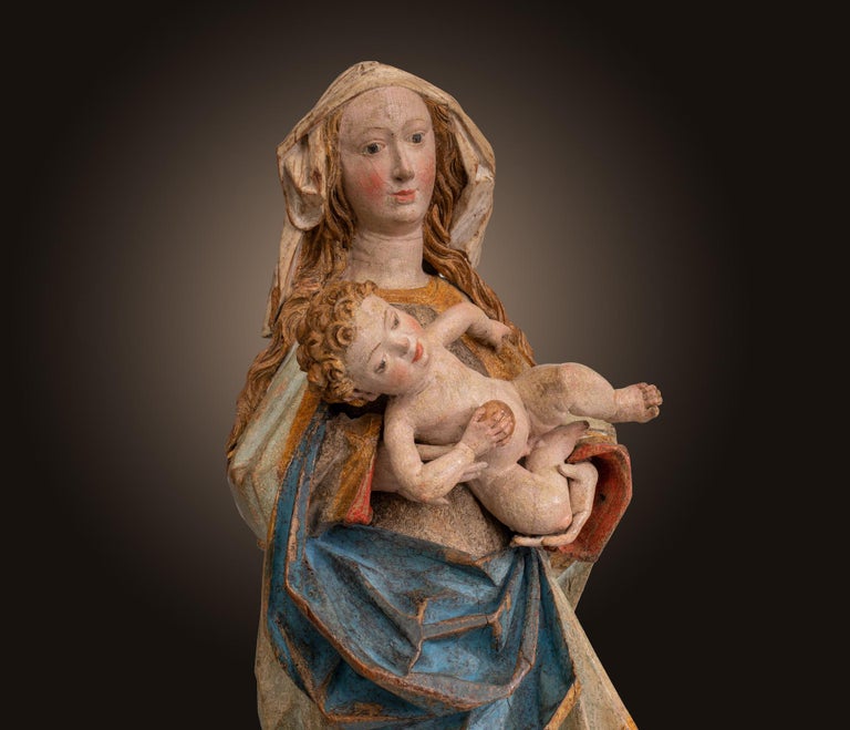 This extremely high-quality Madonna figure (77 cm) made of pine wood shows typical features of the great workshop of the late Gothic sculptor Hans Klocker. The Tyrolean carver was mainly active in the Bressanone and Bolzano area. This Madonna is stylistically related to the famous Tramin Altarpiece (1485-90) in the Bavarian National Museum and possesses an extremely similar quality of carving.