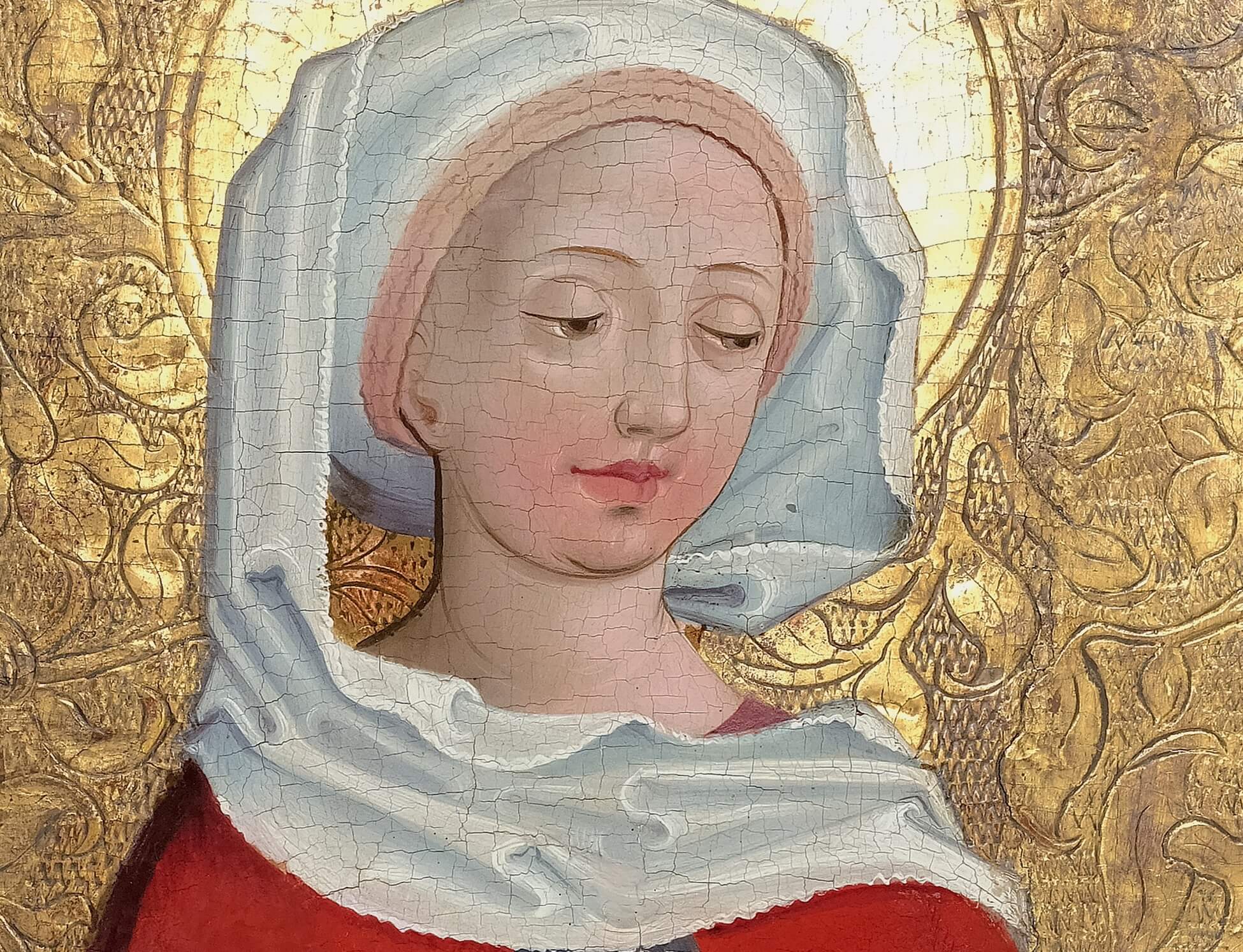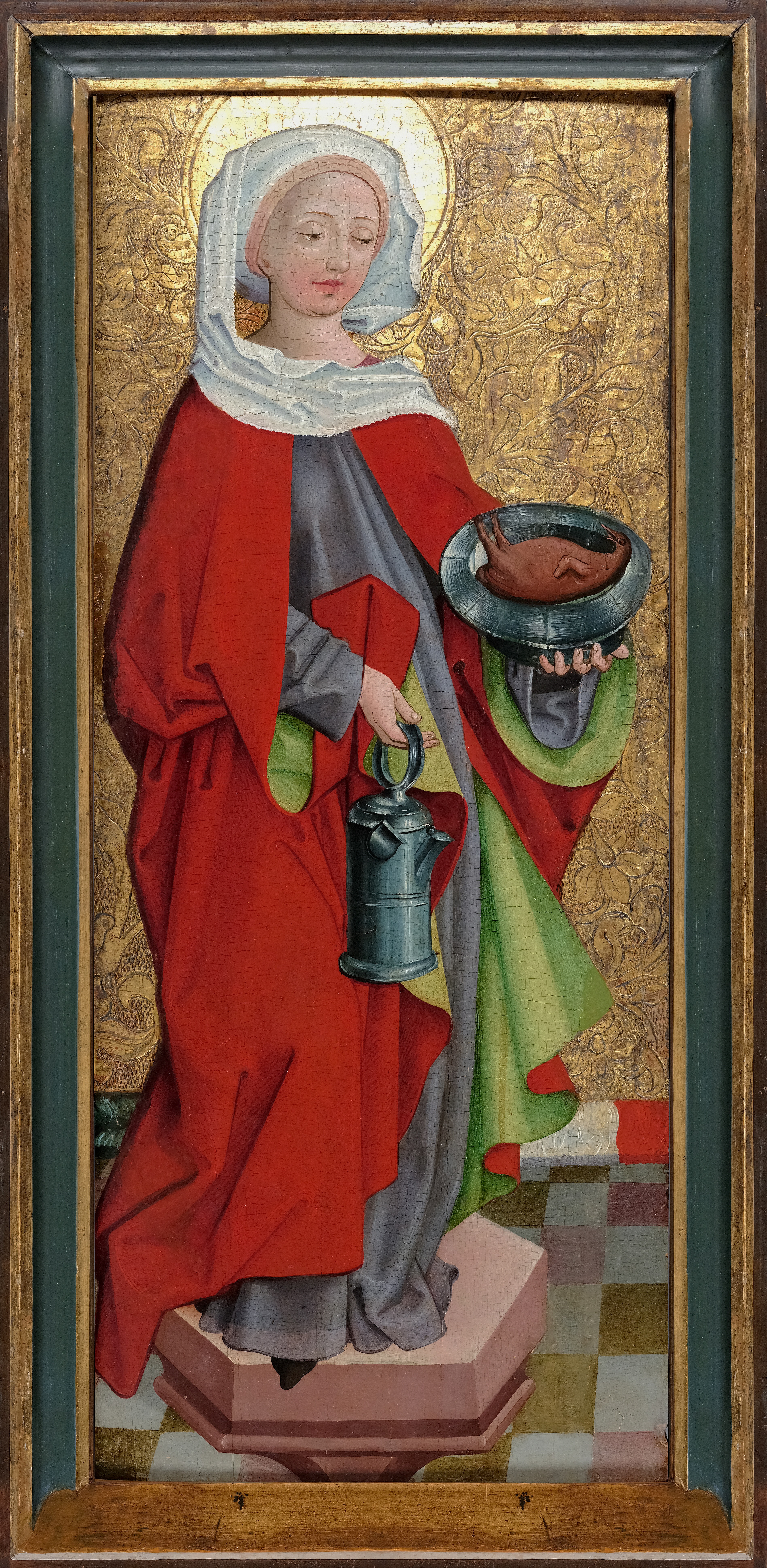 This panel painting, created around 1500 in the Upper Rhine region, depicts Saint Elizabeth of Thuringia in oil on a stippled gold ground. The master painter placed her on a plinth; the ground is tiled in a white and red checked pattern, which creates a realistic impression of depth. The background of the painting is embossed with fine tendrils, a technique that lends the surface structure and a luxurious appearance. The saint’s nimbus is also worked into the gold ground, emphasizing her holiness. The detailed hallmarking reflects the light and further enhances the sacred aura of the depiction.