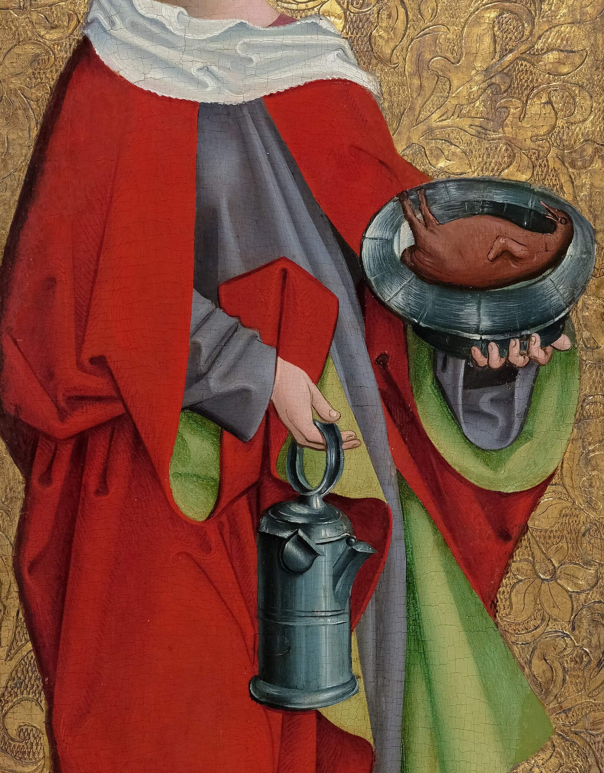 Elisabeth is dressed in a long grey dress that emphasizes her humility and modesty. Over this she wears a bright red cloak with a green inside, the color combination of which creates a harmonious contrasting effect and was often chosen for depictions of Elisabeth. Her white headscarf is wrapped tightly around her head and falls gently over her neck, an equally characteristic element in the depictions of Elizabeth, which could indicate her connection to the Franciscan idea of poverty. Her feet are clad in black, pointed shoes in keeping with late Gothic fashion.