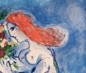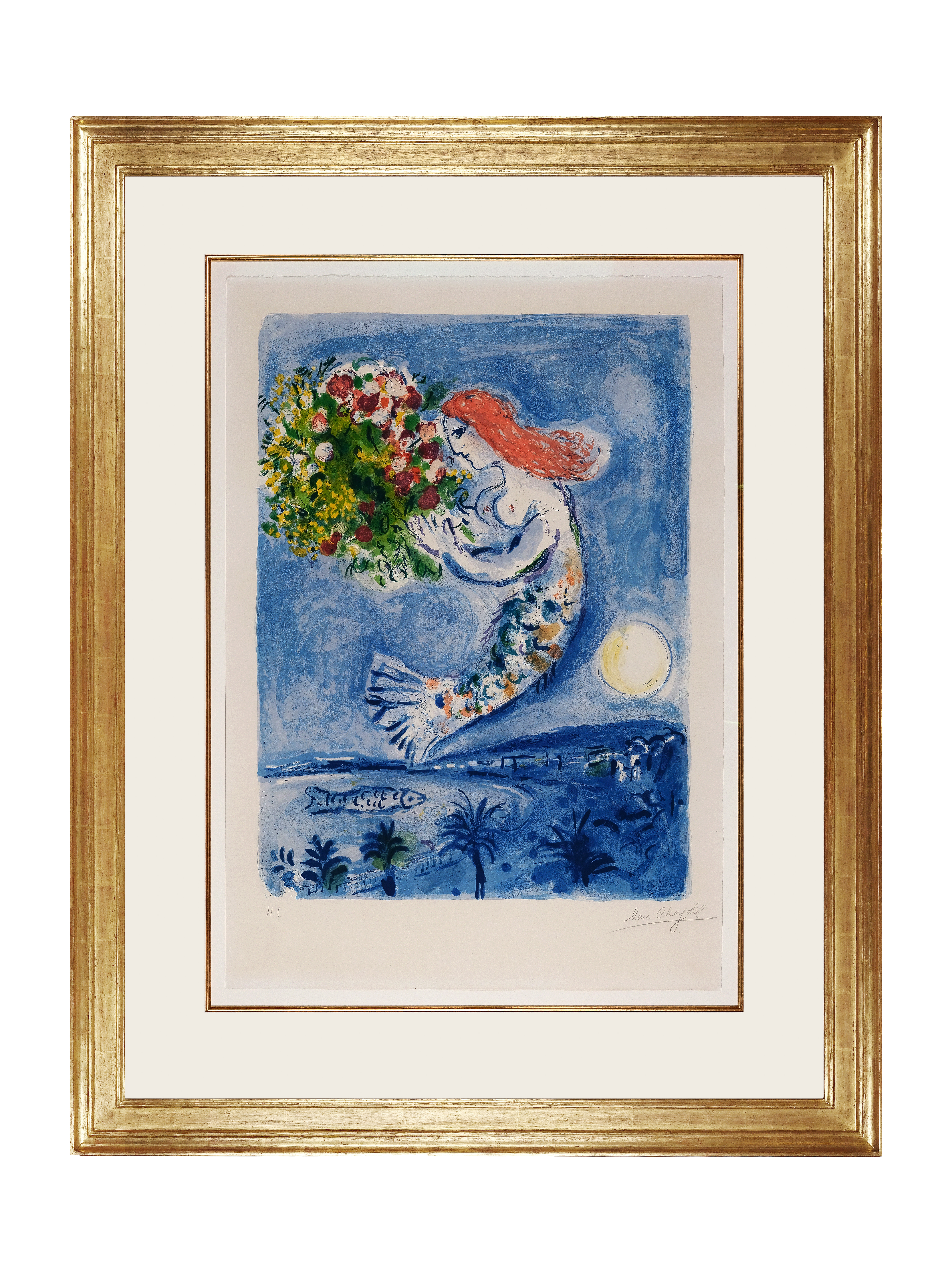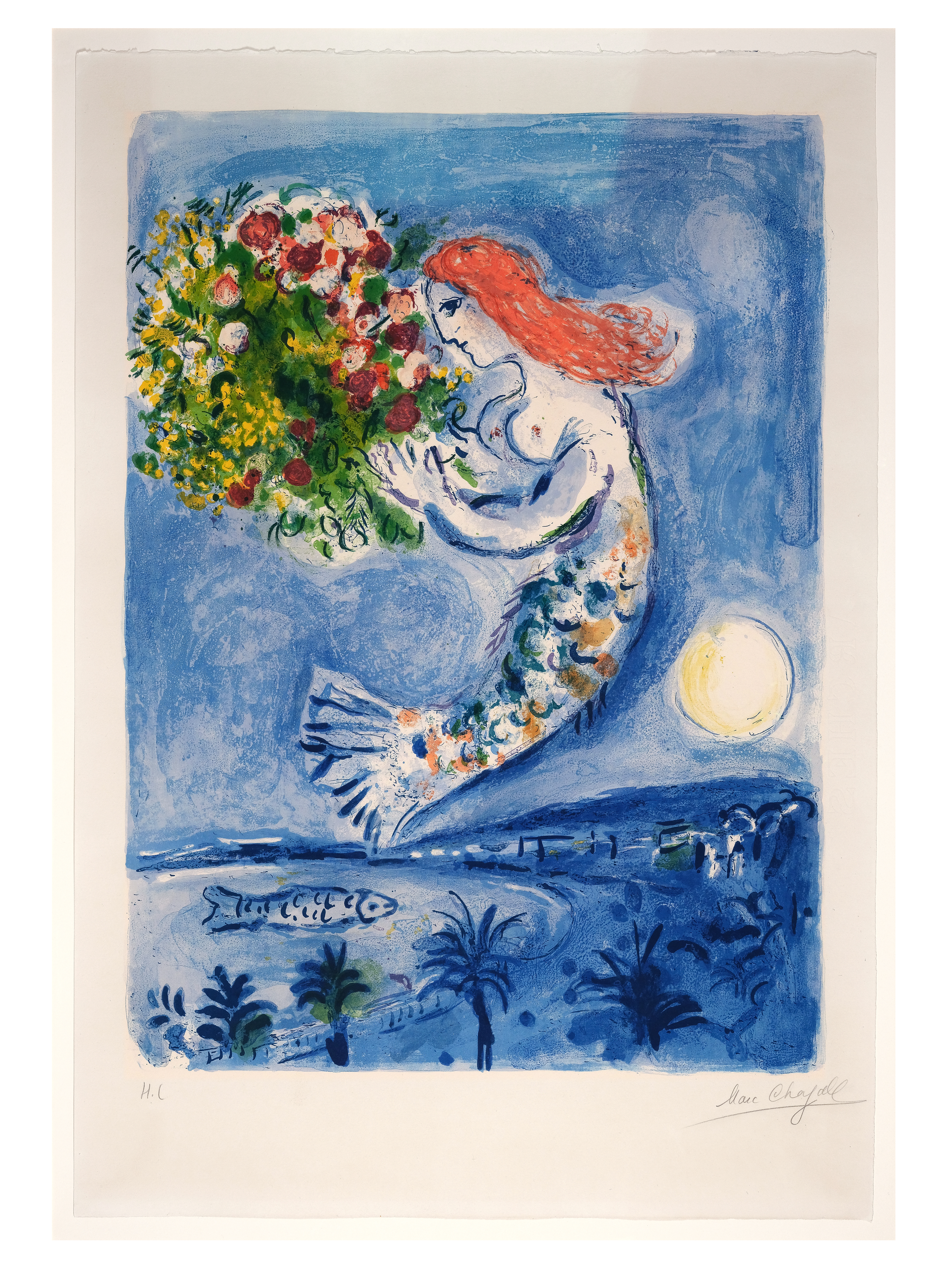 This colour lithograph is probably the most beautiful example of Marc Chagall’s poetic pictorial language, which is characterized by summery lightness and dreamy fantasy. Above all, this work is a declaration of love to his second homeland, France, where the Russian-born artist spent most of his life. In 1949, Marc Chagall moved to Saint-Jean-Cap-Ferrat near Nice, making the Côte d’Azur a central source of inspiration for his work.