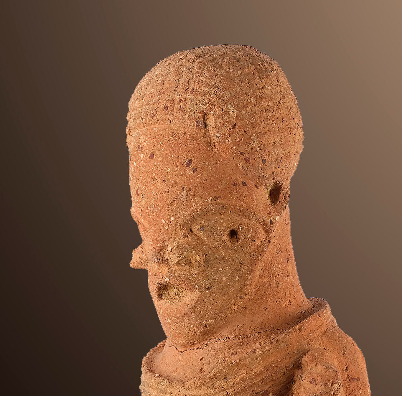 This impressive terracotta figure comes from the Nok culture, one of the earliest known advanced civilizations in West Africa, which flourished between around 1500 BC and the 1st century AD in what is now central Nigeria. The Nok are particularly known for their figurative terracotta art and early knowledge of ironworking.