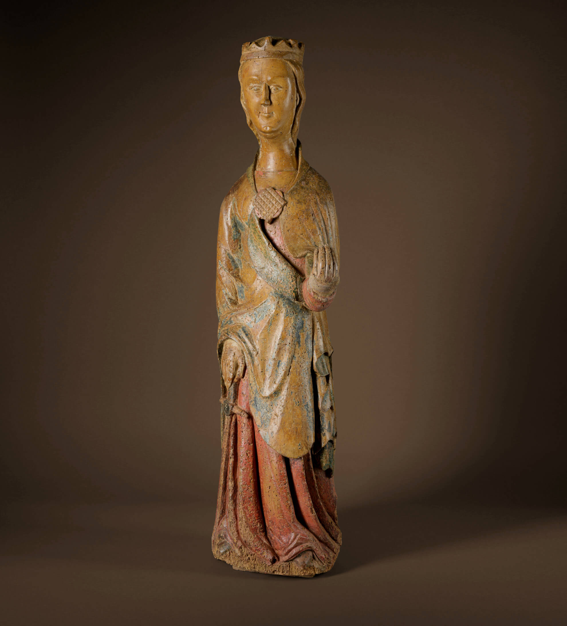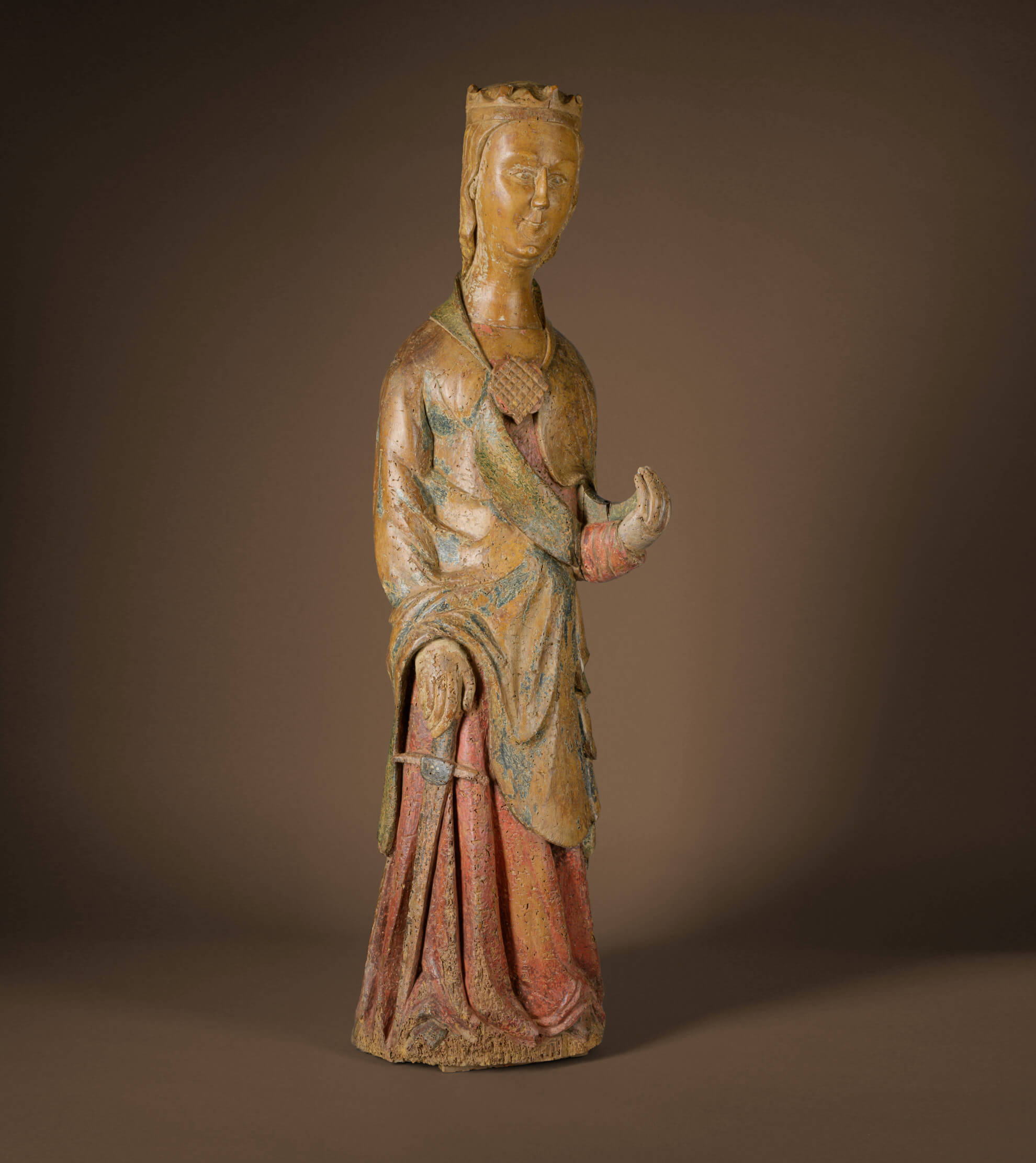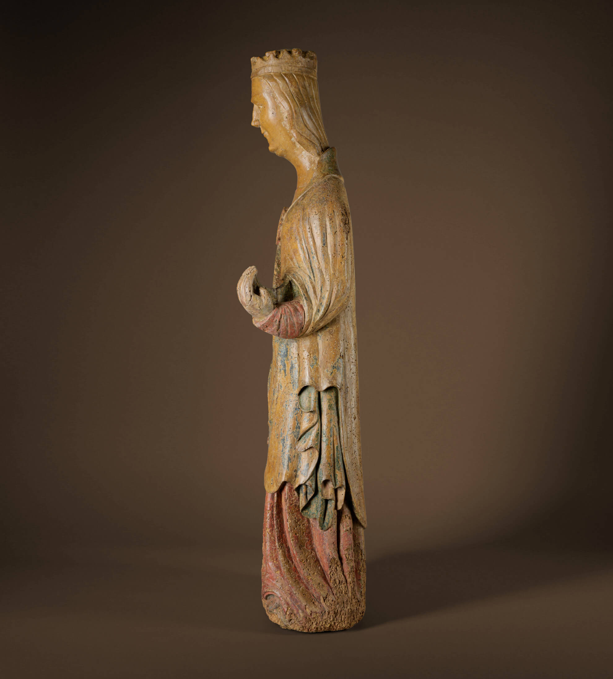 Numerous aspects are convincing of the rarity and museum quality of this highly significant figure. While sculptural representations of St. Catherine are common in the Gothic period, this sculpture from the Romanesque period is probably unique with such an early date around the middle of the 12th century and in this exceptionally good state of preservation. The oldest fresco depicting St. Catherine was created in the first half of the 8th century and the legends surrounding her were consolidated in the following century. In the 10th century she was included in the register of saints and in the 12th century she was considered the patron saint of the Crusaders, with further patronages being added in the 13th century, including that of virgins, wives, philosophers, teachers, printers, hospitals and libraries.