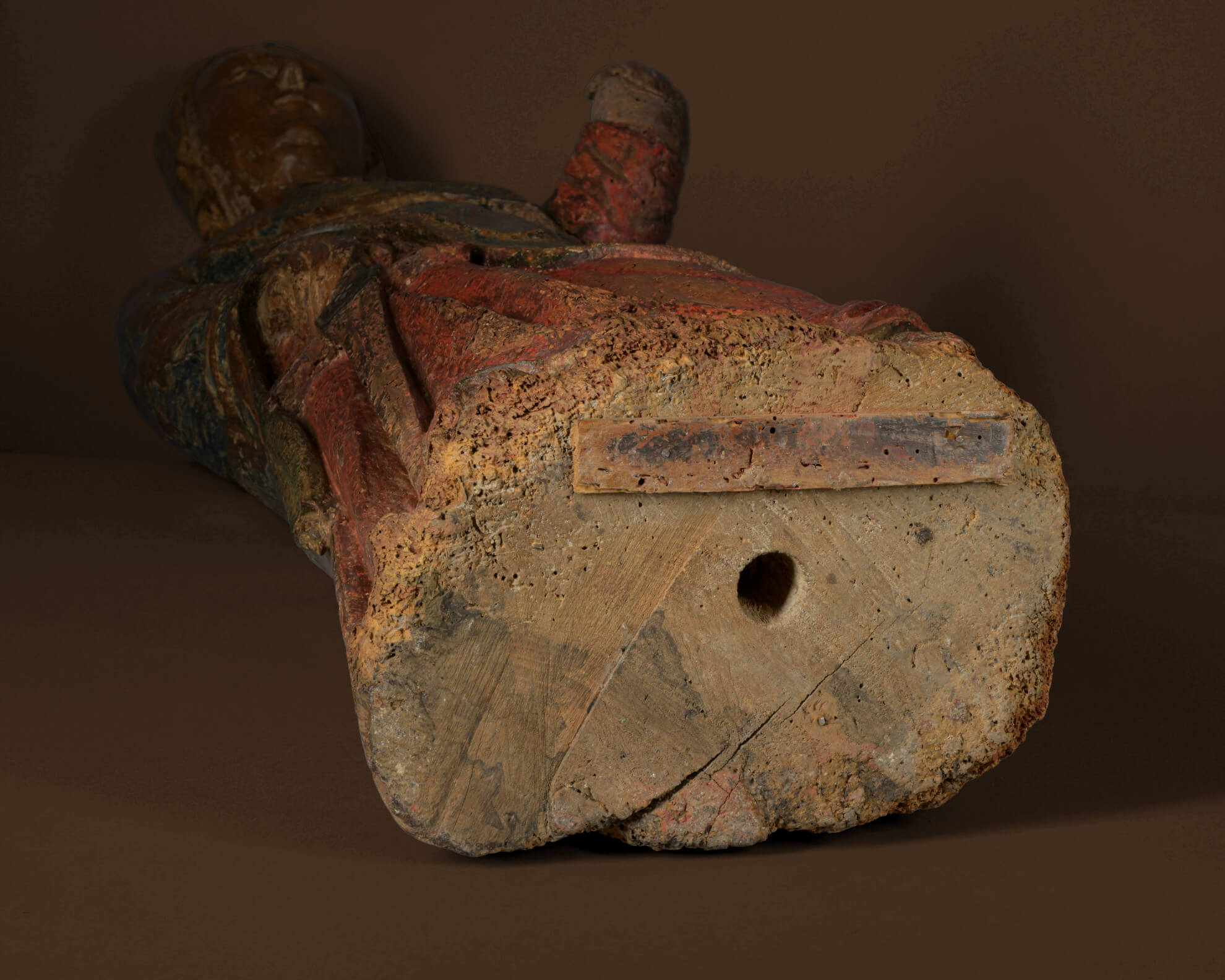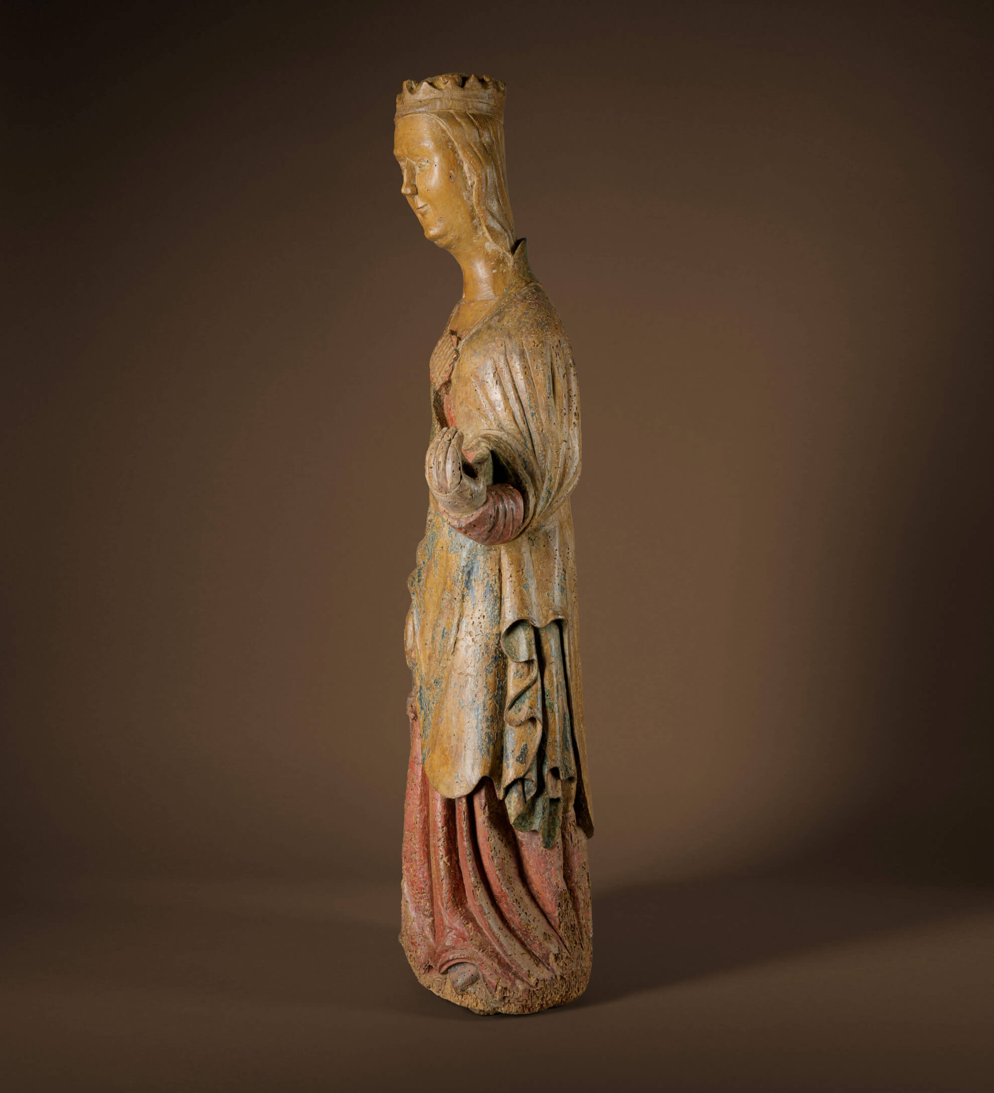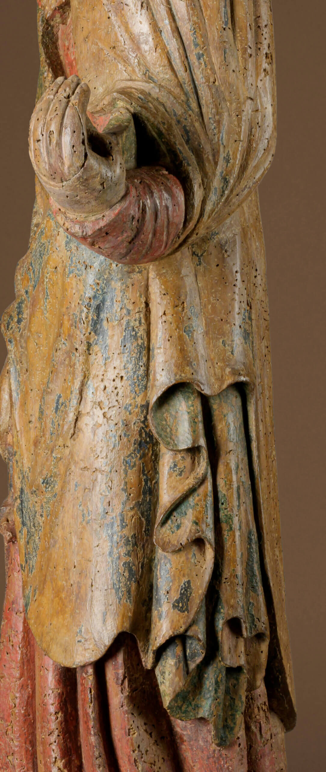 The original polychrome painting of the sculpture is also remarkable. Until the late Gothic period, sculptors were also barrel painters who painted and gilded their carved figures themselves. The three predominant colors – the blue of the outside of the cloak, the green of the inside of the cloak and the red of the dress – can be named after the color nuances correspond to the theory of chemistry: The blue color is probably mountain blue or azure blue, the green probably originated from Tyrolean green earth and the red was most likely made from bright cinnabar. The blue pigment is obtained from azurite and is considered one of the most important and most expensive pigments of all, as lapis lazuli had to be imported from Afghanistan. The pigment of the regionally different green earth was already used in ancient times, mainly for wall paintings. Cinnabar or cinnabarite was used thousands of years before the birth of Christ and is particularly impressive due to its opacity and luminosity, which is also clearly expressed in this sculpture.