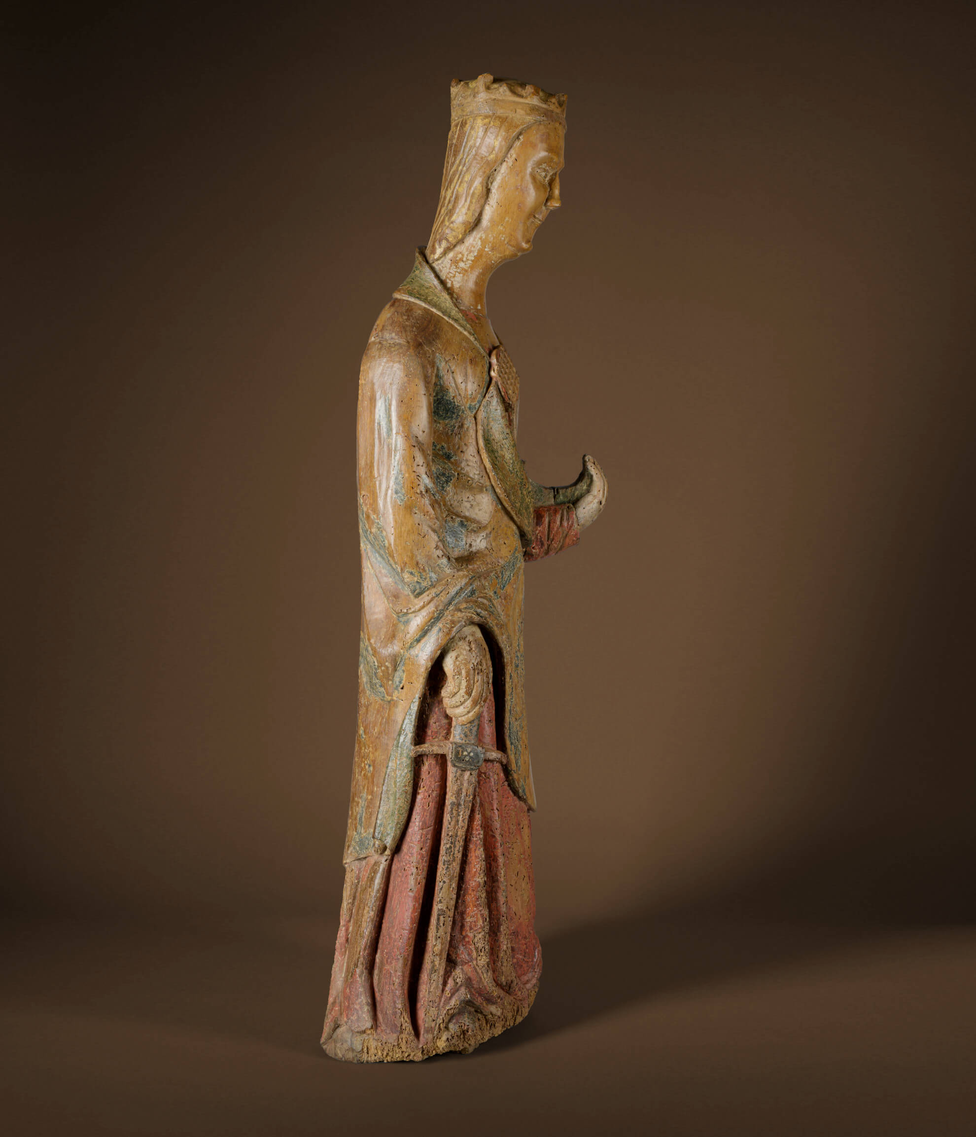 The museum figure is characterized in particular by its size of 99 cm and the chosen material. Romanesque figures made of wood are surprisingly rare in the Alpine region. While Romanesque fragments, reliefs and figures are often preserved in stone, this is a freestanding sculpture made of fine walnut wood, carved in the round. This emphasizes the all-round appearance of this extremely early depiction of Catherine. The sculpture stands upright and has long-limbed proportions and a towering stature. This is emphasized by the elongated, elegant neck and skilfully reflects the typical verticality of Romanesque sculptures. She is holding the chariot wheel in her angled left hand. With her right hand, she grasps the hilt of the long sword with a broad blade, the tip of which almost touches her foot. These are Catherine’s typical attributes as references to her martyrdom, whereby these unmistakable identifying features clearly identify the depiction as Saint Catherine.