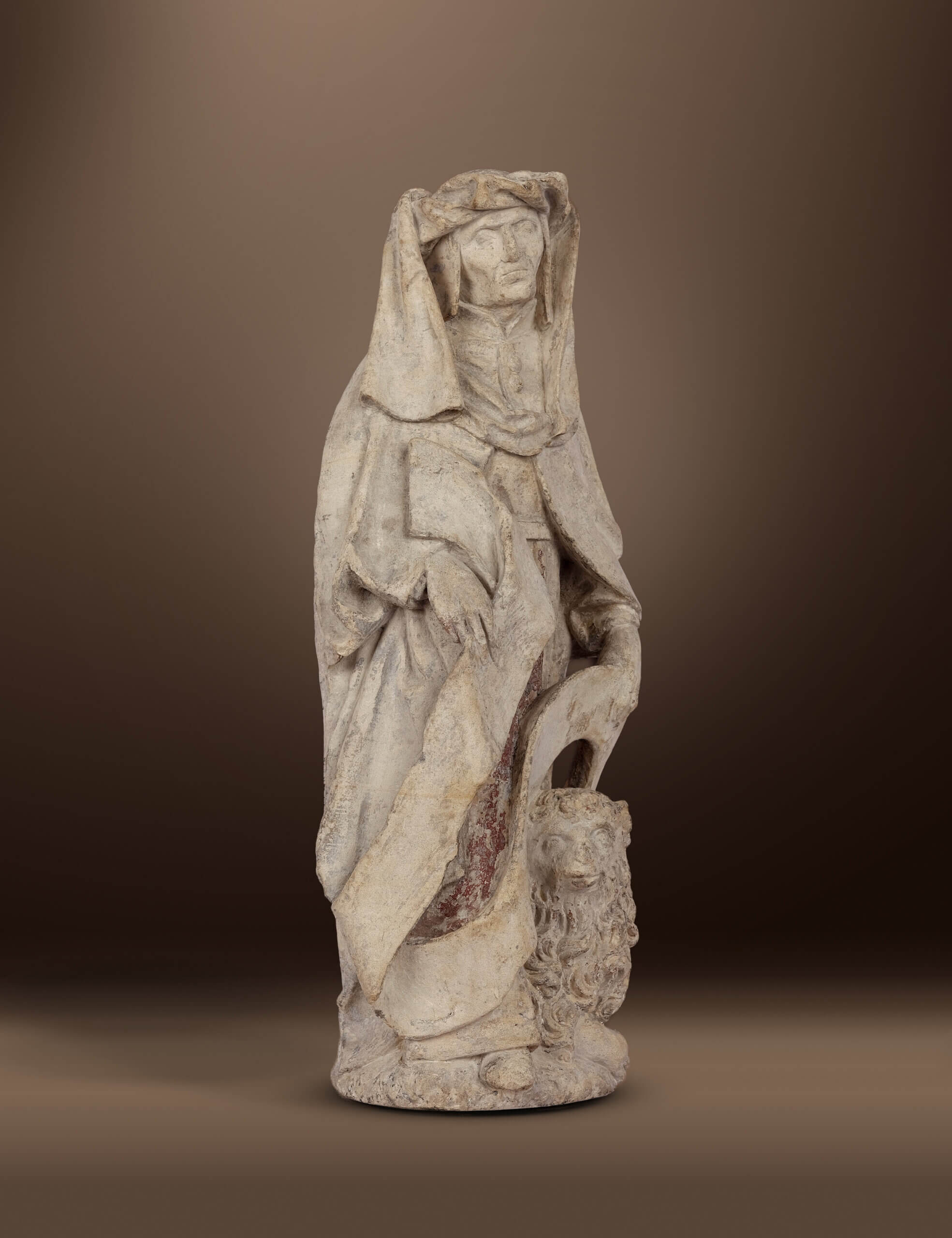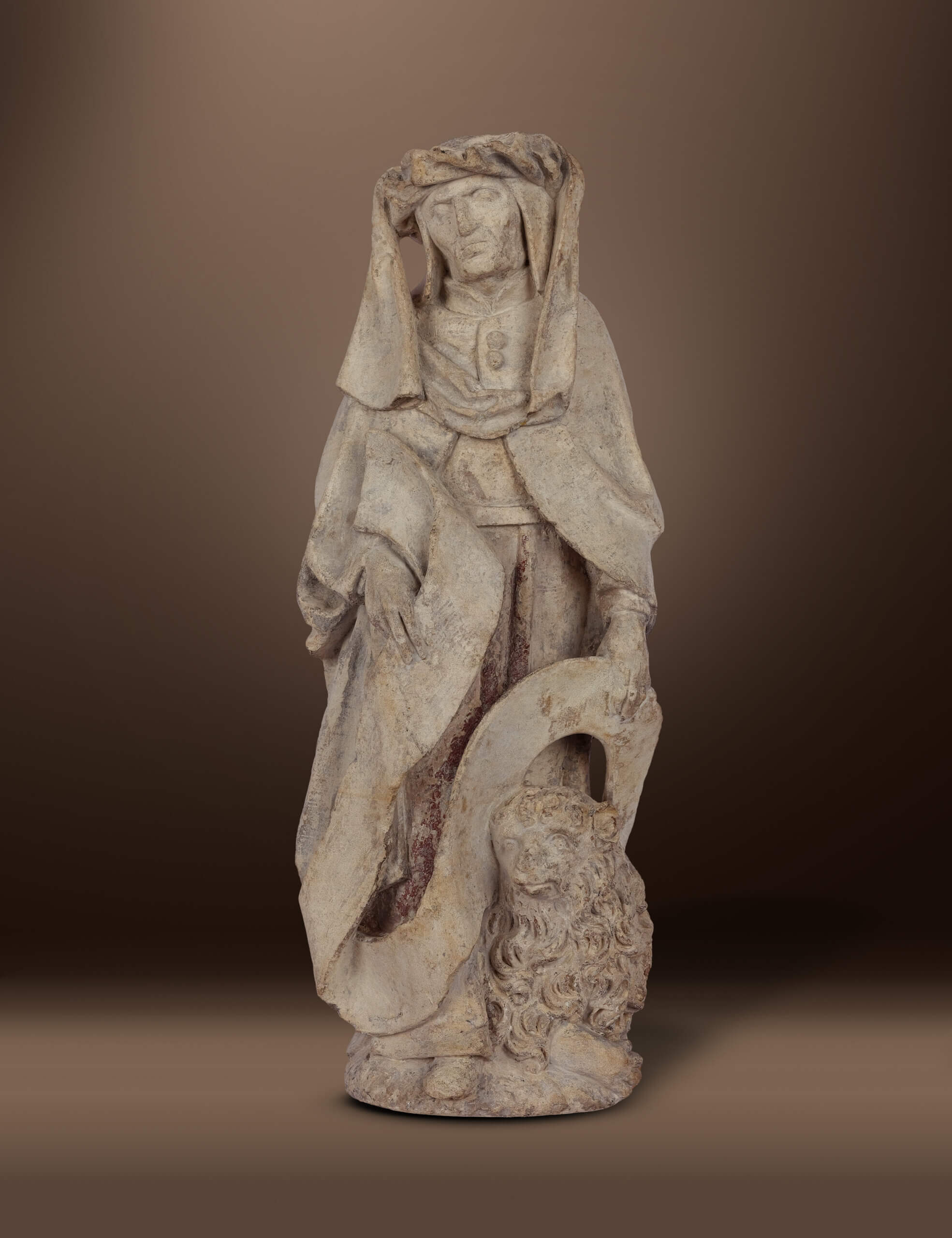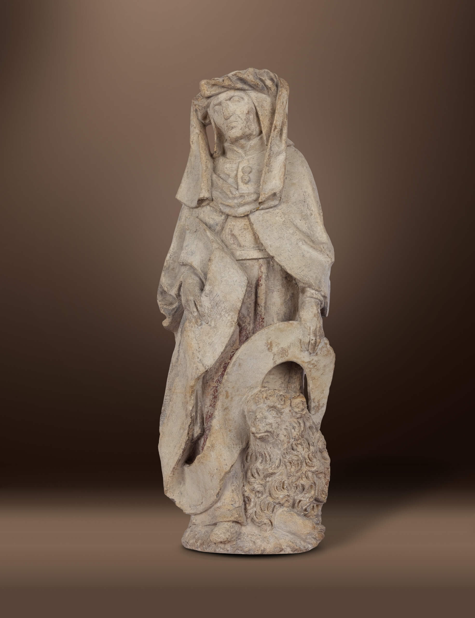 The representations of Jerome are still very much in demand today. Two-dimensional as paintings, these are 15. and 16th century more frequently. Very rare as a three-dimensional sculpture! This extraordinary sculpture of St. Francis of Assisi. Hieronymus convinces with a high artistic quality. It was executed in limestone by a master craftsman and remains of the polychromy are still present.