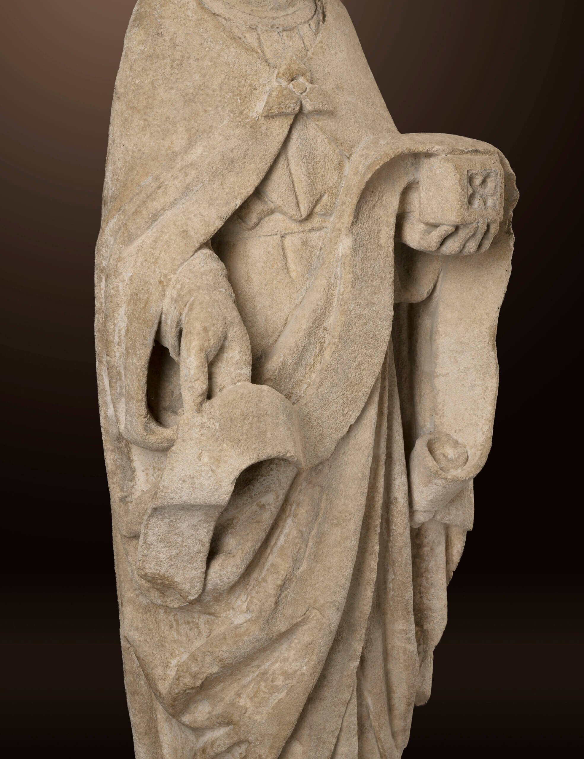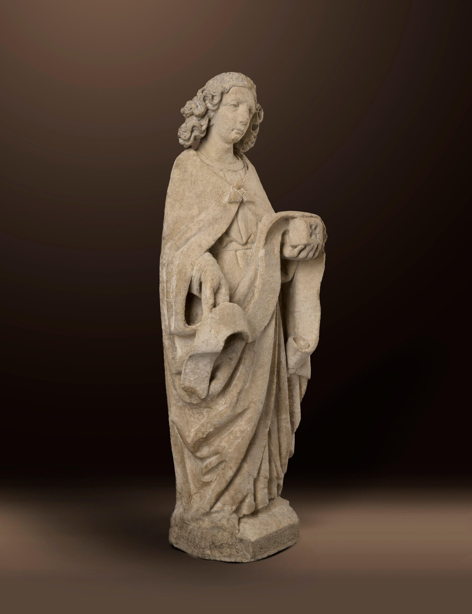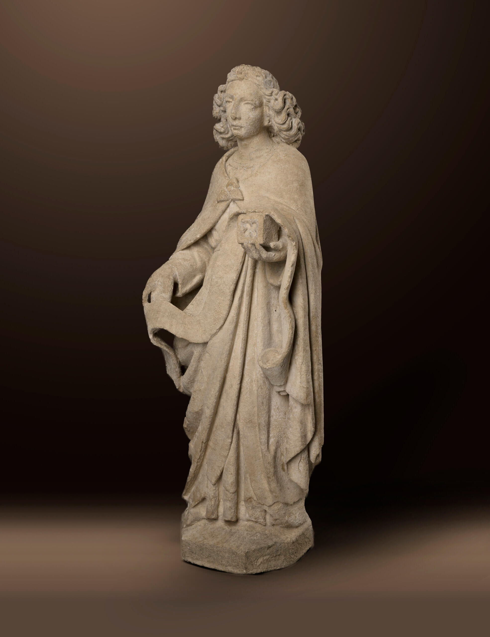 Dans l’ensemble, l’œuvre sculpturale témoigne d’un savoir-faire artistique de très haut niveau, dont l’impression générale précieuse et représentative souligne la virtuosité de la sculpture. Les caractéristiques distinctives que l’on reconnaît ici se retrouvent dans des œuvres picturales comparables provenant d’Utrecht vers le milieu du 15e siècle, époque à laquelle l’art sculptural – en particulier la sculpture sur pierre – se distinguait par une qualité remarquablement élevée. Il convient de souligner le type de tête accentué d’Utrecht, avec un visage ovale allongé, des yeux en amande aux paupières lourdes et des touffes de cheveux denses et saillantes qui encadrent la tête. Par exemple, la figure est comparable à un chapiteau d’ange sur le côté est du jubé de la Joriskerk d’Amersfoort (province d’Utrecht) datant du deuxième quart du 15e siècle. Non seulement la physionomie et les cheveux, qui sont un peu plus horizontaux sur le côté dans l’exemple comparatif, mais aussi le bourrelet du vêtement au-dessus de la ceinture sont similaires. Des motifs encore plus proches, comme les plis de la cuvette habilement placés, se retrouvent sur la statue en calcaire de Ste. Agnès vers 1450 (Centraal Museum Utrecht 1788-003). En outre, les cheveux sont ici déployés en éventail sur les côtés de la tête, de manière similaire à la coiffure. Il en va de même pour l’image du manteau protecteur d’une sainte. Sainte Ursule vers 1460-70 en bois de chêne (Amsterdam Begijnhof, chapelle), dont les cheveux semblent « empilés » de manière uniforme autour de la tête. Cependant, dans l’exemple comparatif, la chevelure semble moins agitée et donc plus retenue ; les rides du bol semblent également plus profondes et plus anguleuses que chez le Jean présenté ici. C’est pourquoi l’ange peut être situé stylistiquement entre Agnès et Ursule. Des œuvres plus tardives, par exemple une console d’ange portant un blason vers 1475 en bois de chêne (Ordre des chevaliers allemands, Bailliage d’Utrecht, Maison allemande), montrent des mèches de cheveux séparées et parallèles vers le bas, qui semblent déjà recouvertes de manière maniériste. De même, sur un fragment en calcaire d’un ange datant de 1480 environ (Leiden Stedelijk Museum de Lakenhal B145), les cheveux sont travaillés de manière plus uniforme et symétrique que sur l’ange présenté ici. On retrouve le même type de tête sur deux anges avec les Arma Christi en bois de chêne vers 1490 (Essen, collection Marks-Thomée), les cheveux dépassant déjà largement en volume le visage de petite taille et la draperie étant beaucoup plus anguleuse.