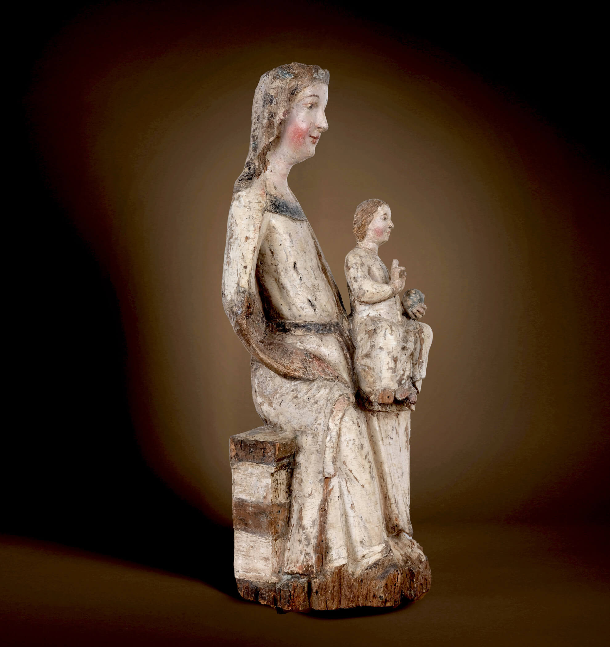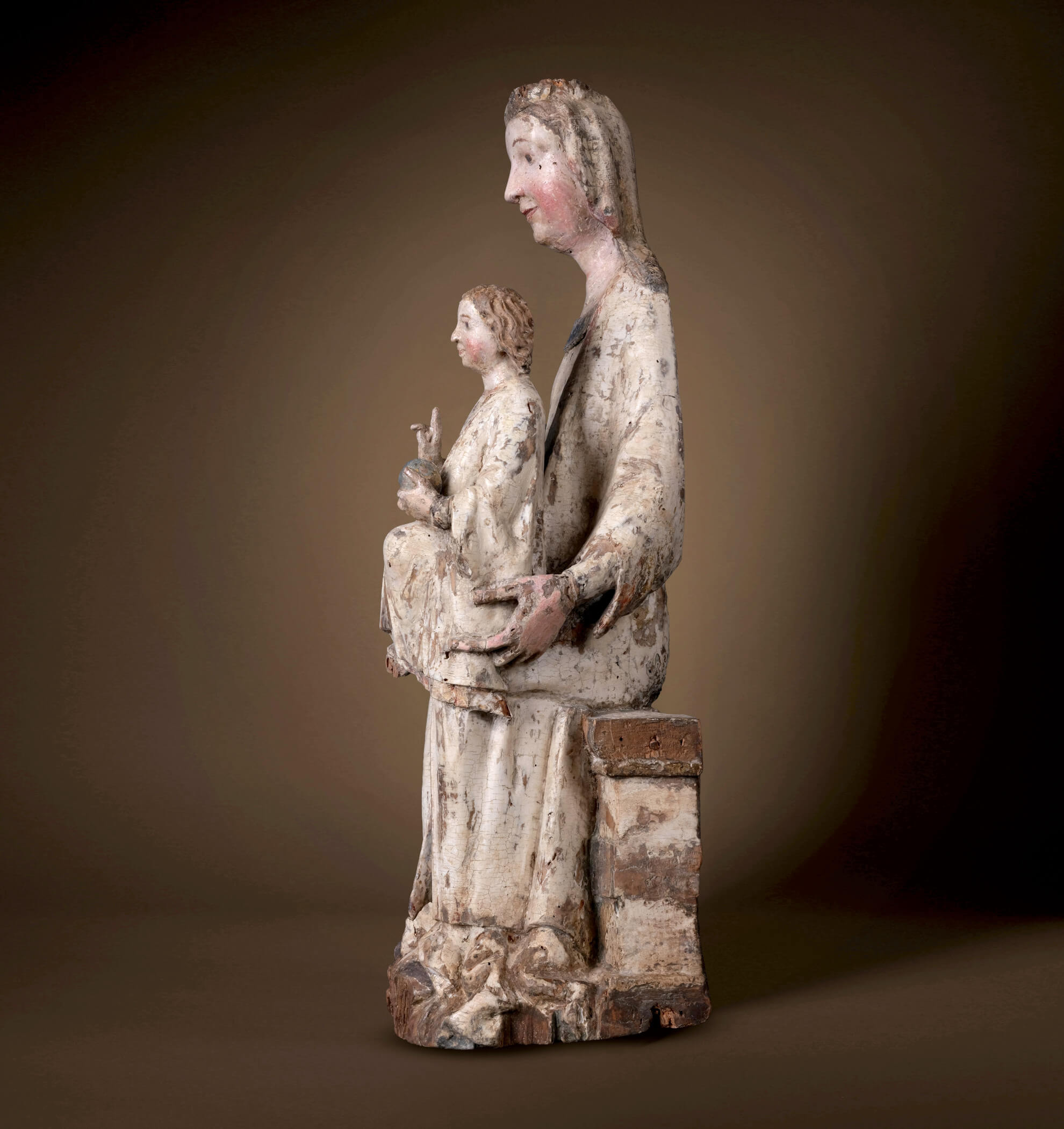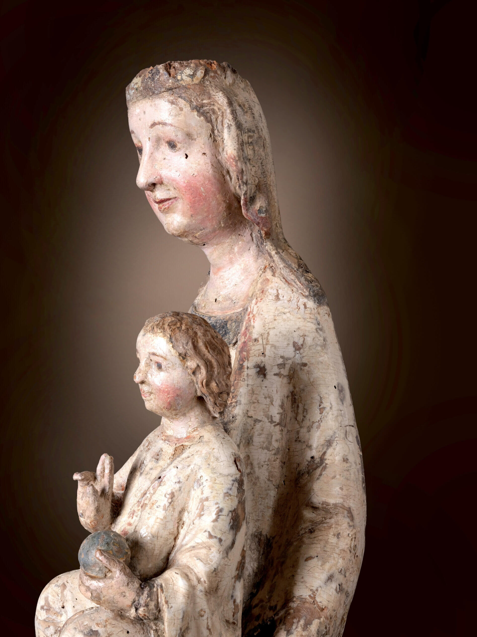 Les relations politiques entre Salzbourg et la Bohême étaient tout aussi importantes. L’archevêché de Salzbourg possédait une autorité ecclésiastique importante et son influence s’étendait souvent aux régions voisines, comme la Bohême, créant ainsi d’importants réseaux de diffusion des pratiques religieuses et des styles artistiques. Ces liens n’étaient pas seulement ecclésiastiques, ils étaient également encouragés par des alliances entre les familles régnantes. Les mariages et les accords diplomatiques entre les archevêques de Salzbourg et les souverains de Bohême renforcèrent ces liens et favorisèrent l’échange d’idées entre les deux régions. Ces liens sont devenus encore plus évidents au cours des siècles suivants avec le gothique international. Cette Madone, qui précède ce que l’on appelle les « Belles Madones » du style international ultérieur, est l’une des premières sculptures à témoigner des liens culturels entre Salzbourg et la Bohême – une preuve du dialogue artistique et religieux qui prospérait grâce aux routes commerciales et aux frontières ecclésiastiques communes de l’époque.
