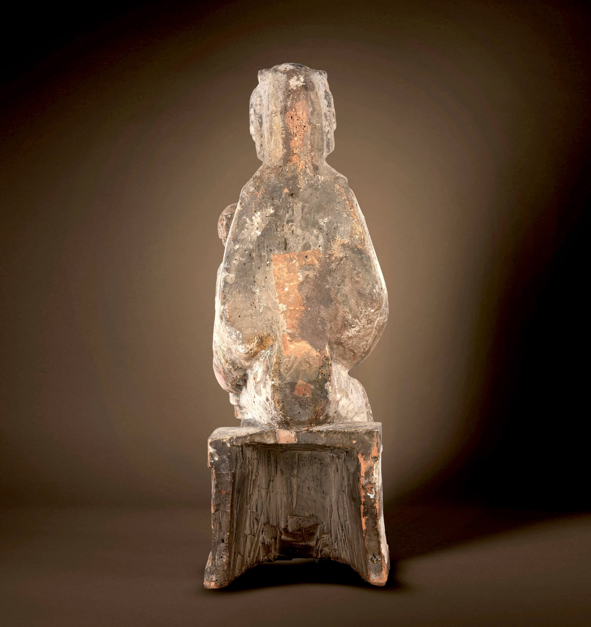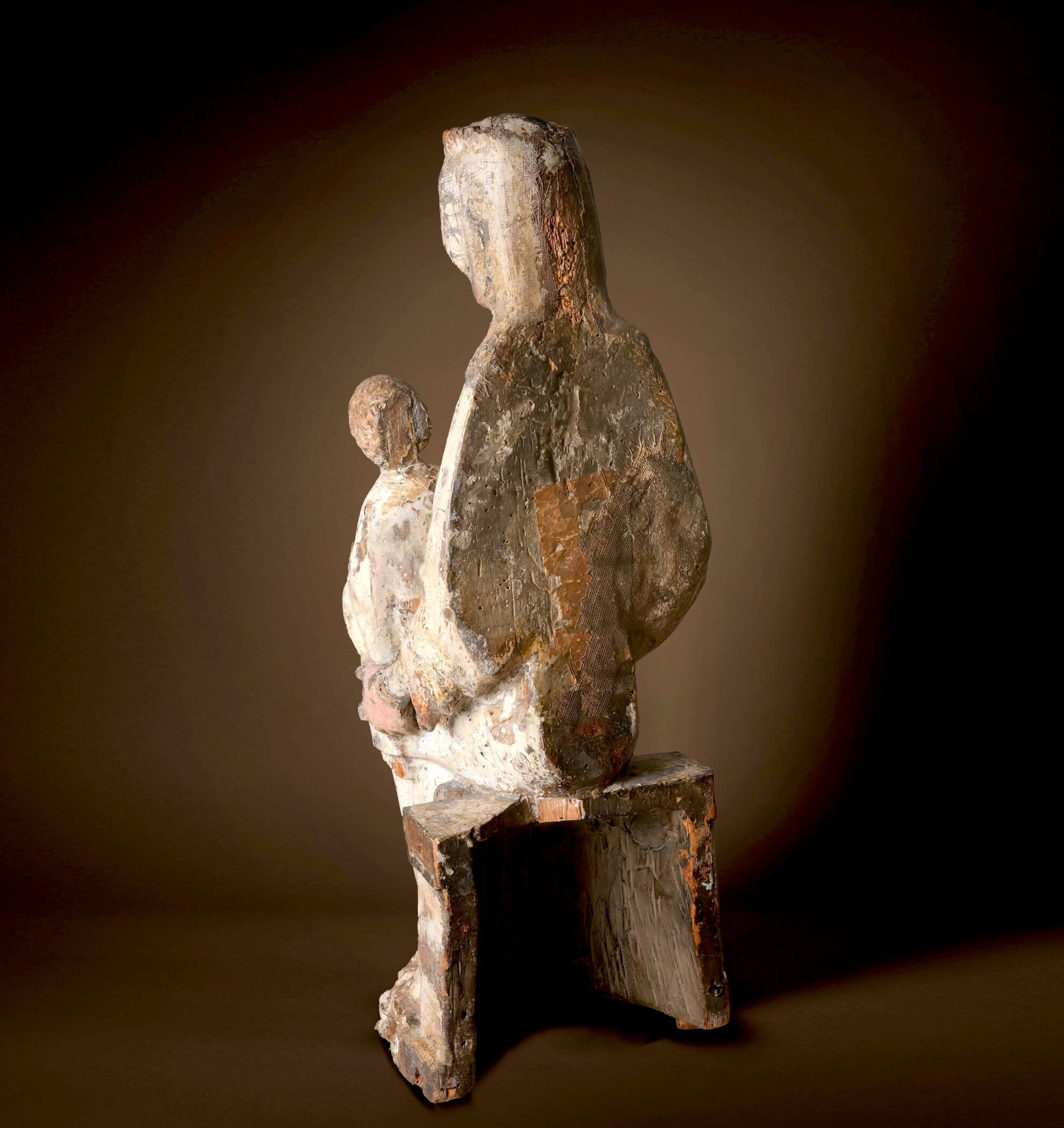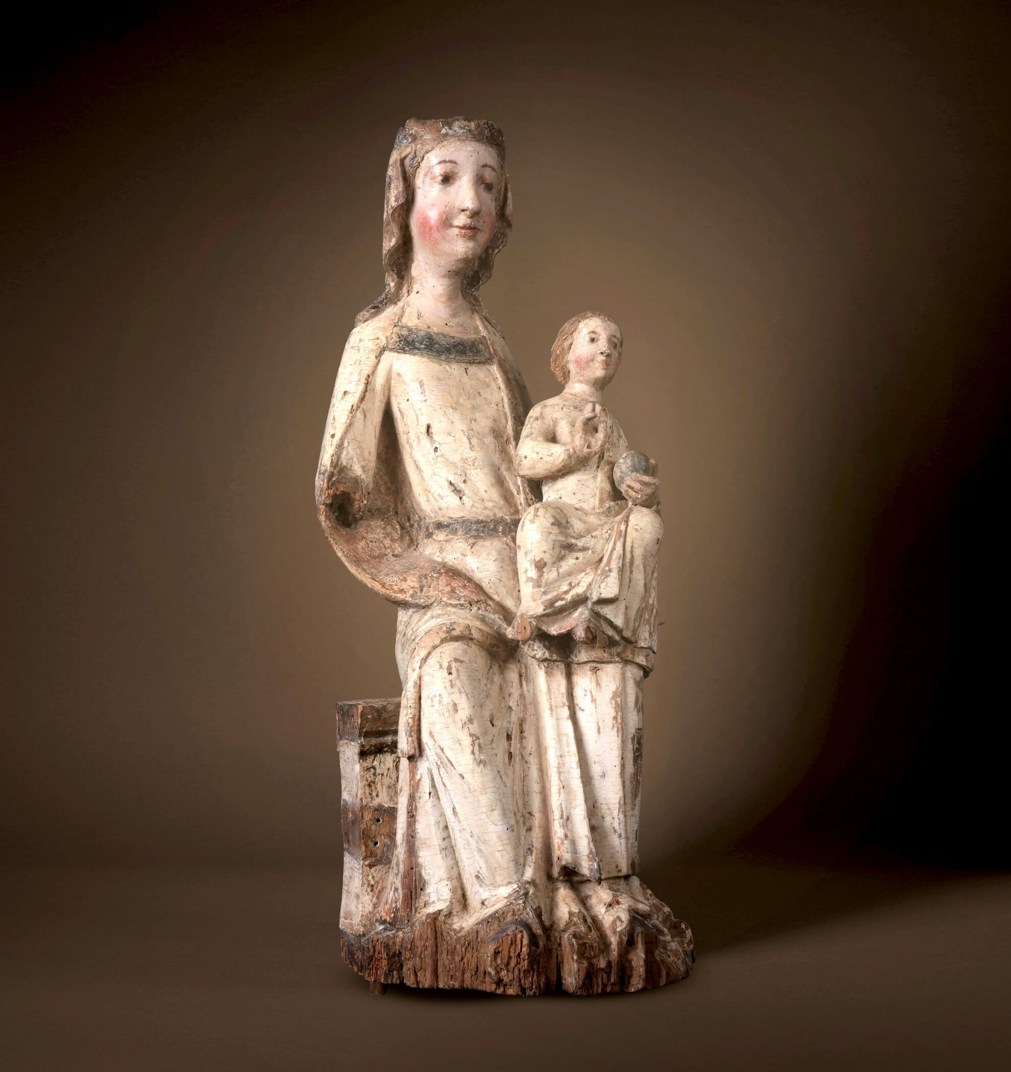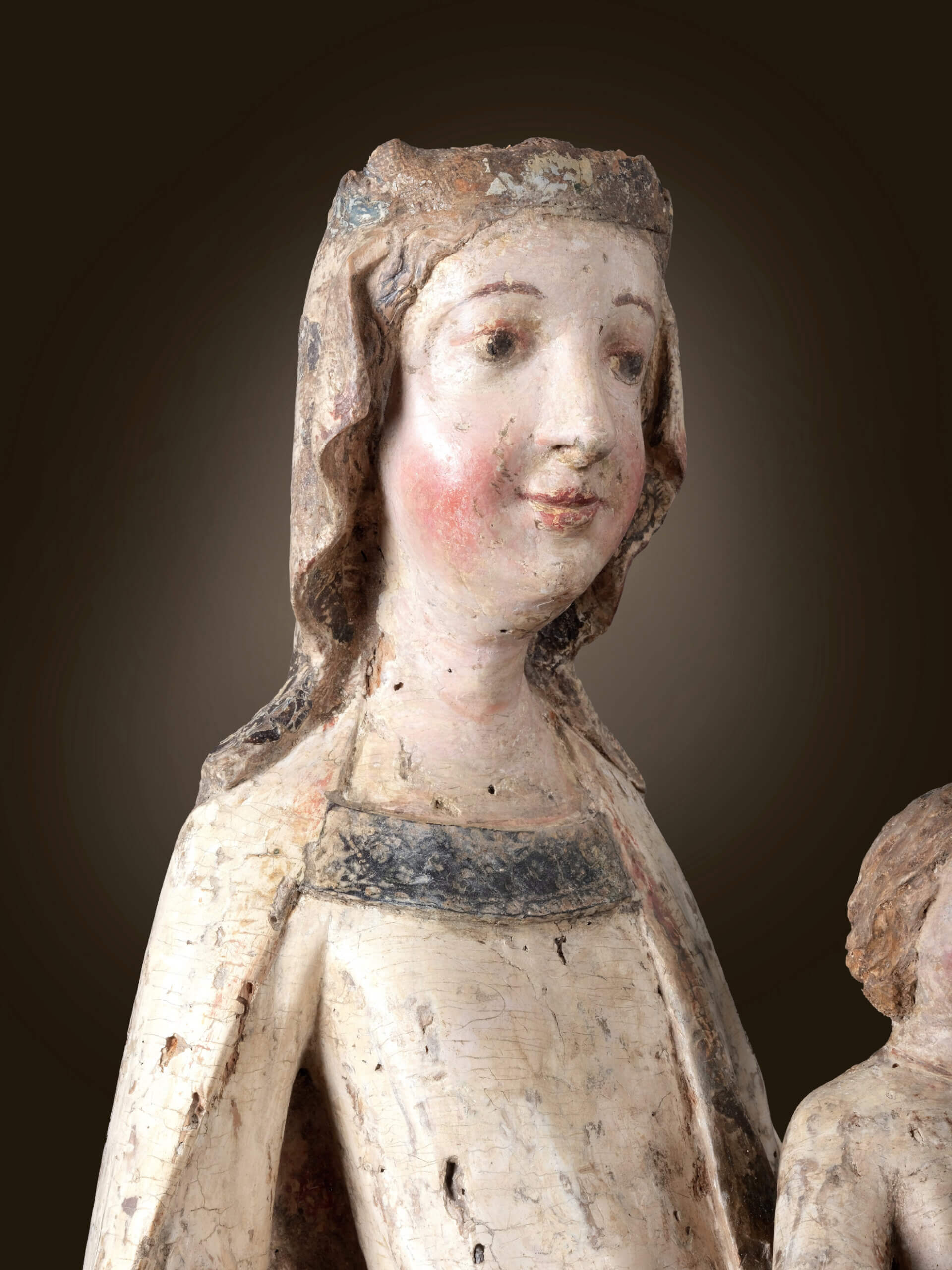 Les relations politiques entre Salzbourg et la Bohême étaient tout aussi importantes. L’archevêché de Salzbourg possédait une autorité ecclésiastique importante et son influence s’étendait souvent aux régions voisines, comme la Bohême, créant ainsi d’importants réseaux de diffusion des pratiques religieuses et des styles artistiques. Ces liens n’étaient pas seulement ecclésiastiques, ils étaient également encouragés par des alliances entre les familles régnantes. Les mariages et les accords diplomatiques entre les archevêques de Salzbourg et les souverains de Bohême renforcèrent ces liens et favorisèrent l’échange d’idées entre les deux régions. Ces liens sont devenus encore plus évidents au cours des siècles suivants avec le gothique international. Cette Madone, qui précède ce que l’on appelle les « Belles Madones » du style international ultérieur, est l’une des premières sculptures à témoigner des liens culturels entre Salzbourg et la Bohême – une preuve du dialogue artistique et religieux qui prospérait grâce aux routes commerciales et aux frontières ecclésiastiques communes de l’époque.