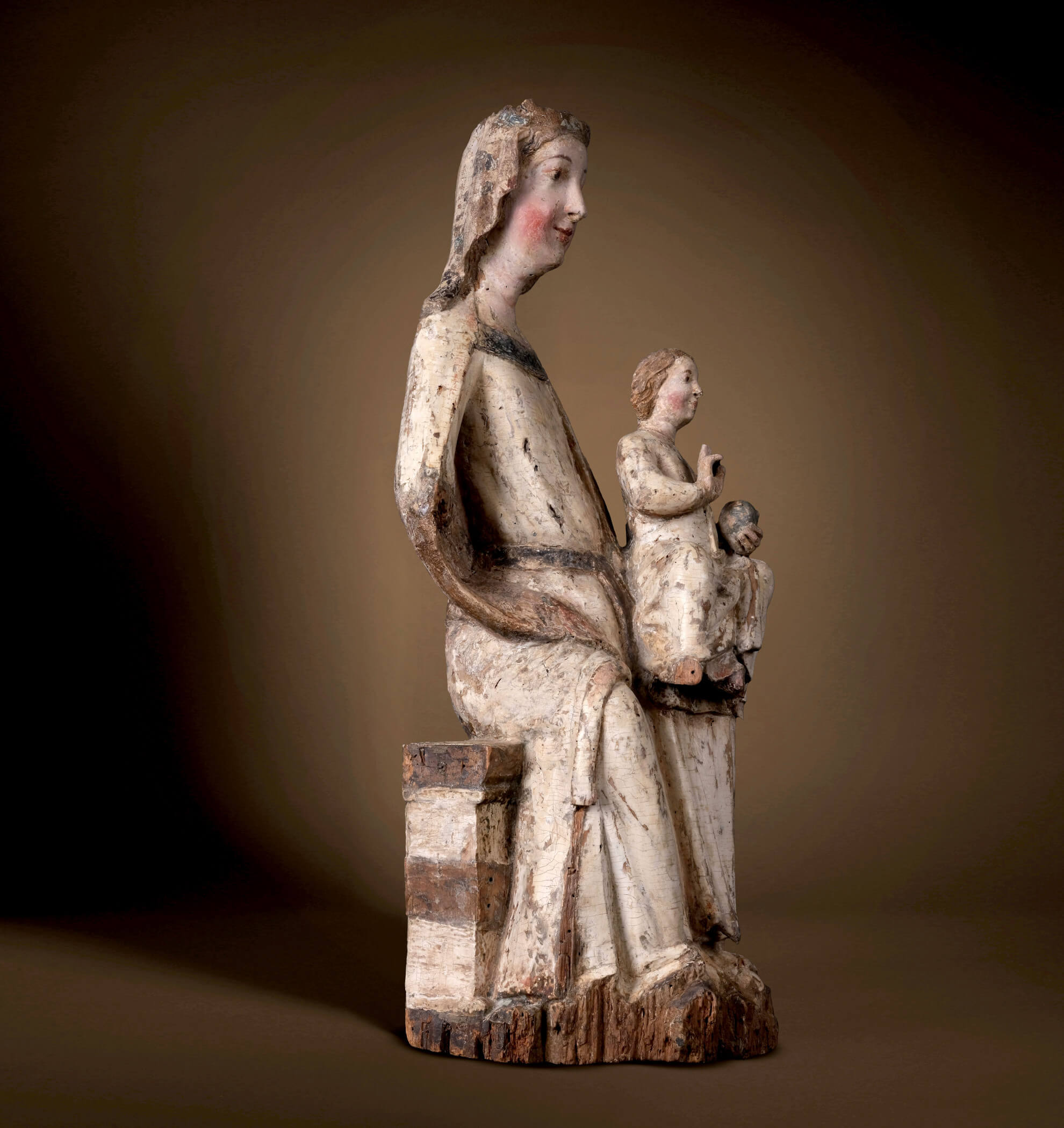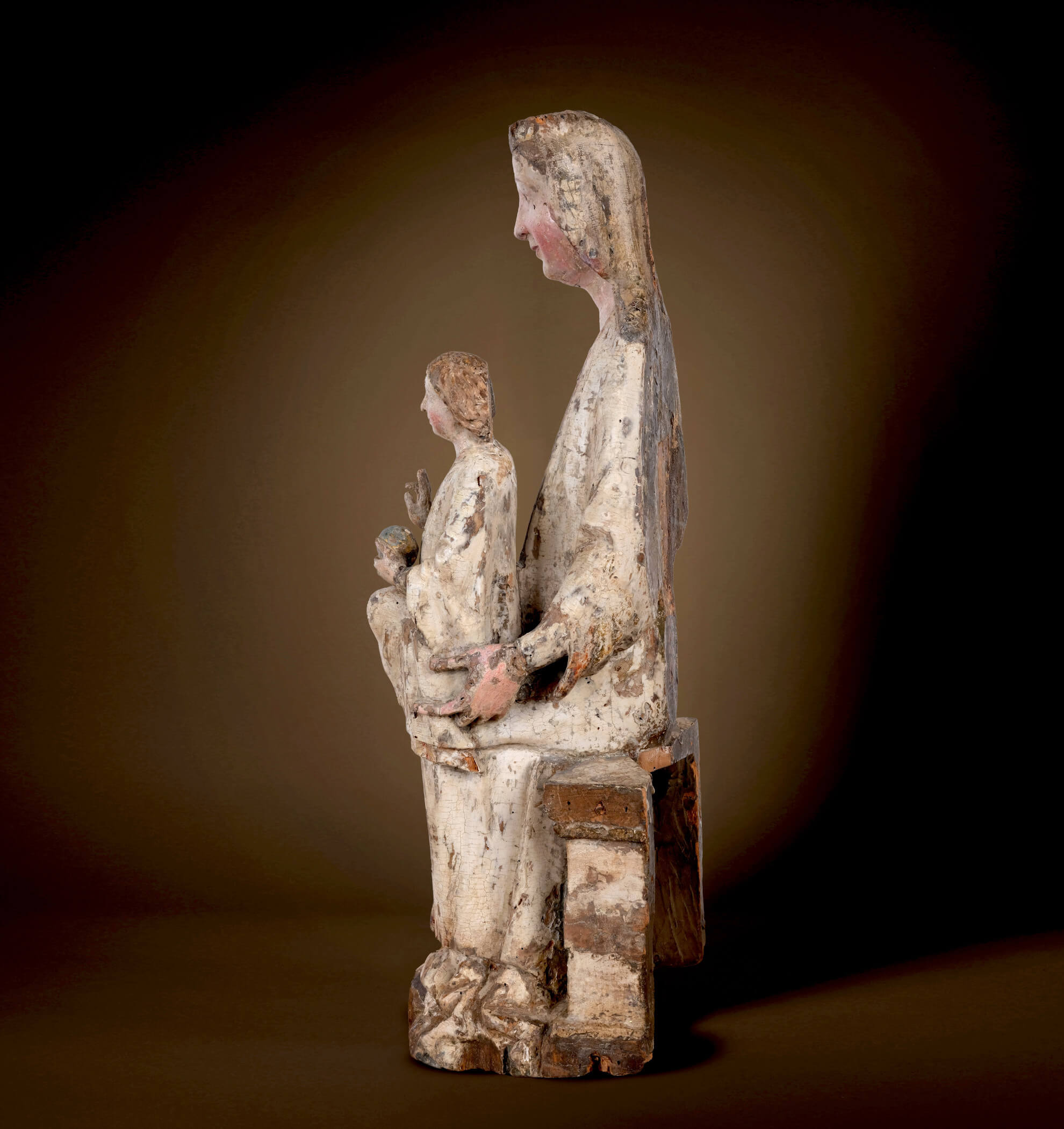 Cette Vierge de la région de Salzbourg, datant des environs de 1220-1250, est un exemple remarquable de la tradition de la sculpture en bois polychrome, particulièrement développée à cette époque à Salzbourg et dans les régions alpines. Le matériau utilisé, le bois de tilleul, était préféré pour sa douceur et la finesse de son grain. Il permettait une sculpture détaillée, visible dans les drapés et les traits du visage. La polychromie donne vie aux personnages et leur confère une présence imposante, soulignant à la fois le réalisme et le caractère surnaturel des personnes représentées pour les observateurs médiévaux. Cette œuvre fait le lien entre le style roman, connu pour ses formes stylisées et symboliques, et le naturalisme gothique naissant, caractérisé par des personnages plus proches de la vie et des visages expressifs. La surface étonnamment bien conservée souligne la rareté et l’importance de la sculpture. Trouver une version aussi bien conservée de cette époque fait de cette Sedes Sapientiae une rareté muséale.