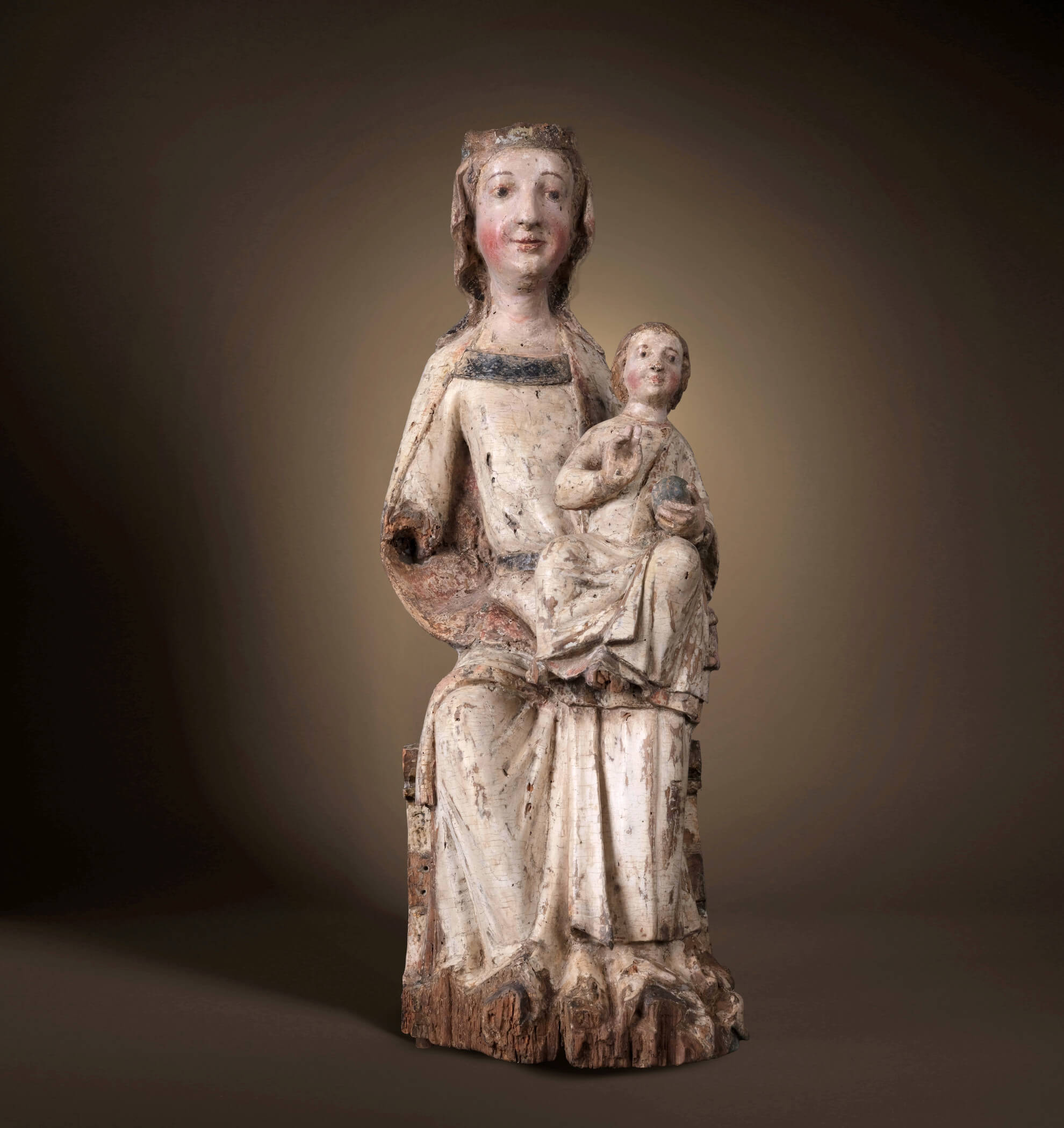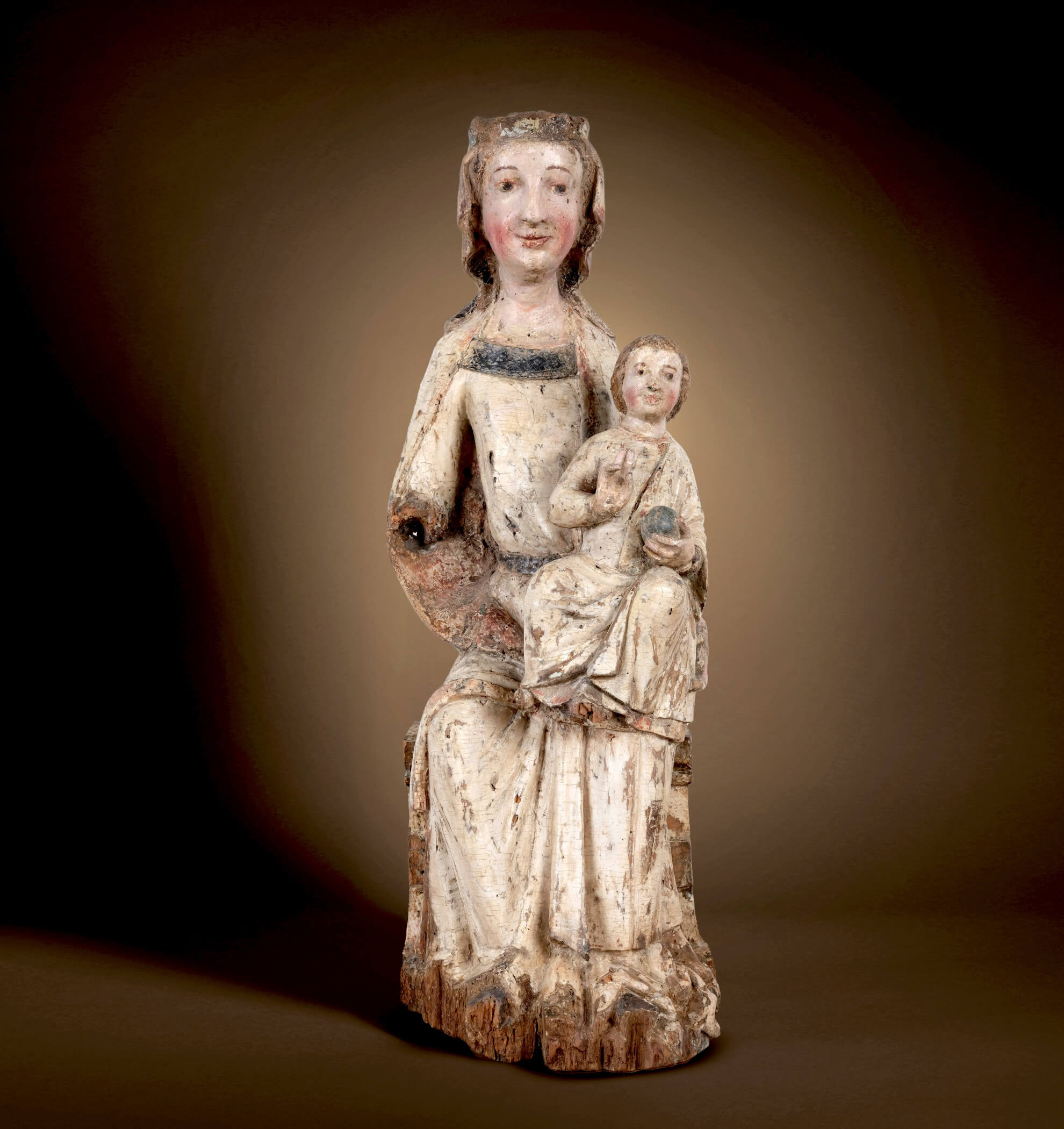 L’enfant Jésus est assis sur le genou gauche de Marie et est également vêtu. Avant 1400, l’Enfant Jésus est presque toujours représenté vêtu pour souligner son rôle sacré. Dans sa main gauche, il tient un globe qui symbolise sa domination sur le monde et le montre comme Salvator Mundi. Sa main droite est levée dans un geste de bénédiction ou de parole, signe de son autorité et de sa sagesse divines. Marie et Jésus sont tous deux directement tournés vers le spectateur. L’expression de leur visage est ouverte et solennelle, avec des yeux en amande, des sourcils étroits et des bouches qui sourient doucement. Leurs joues rouges et juvéniles leur confèrent un caractère naturaliste qui montre l’évolution du style médiéval vers des figures plus expressives et plus humaines.