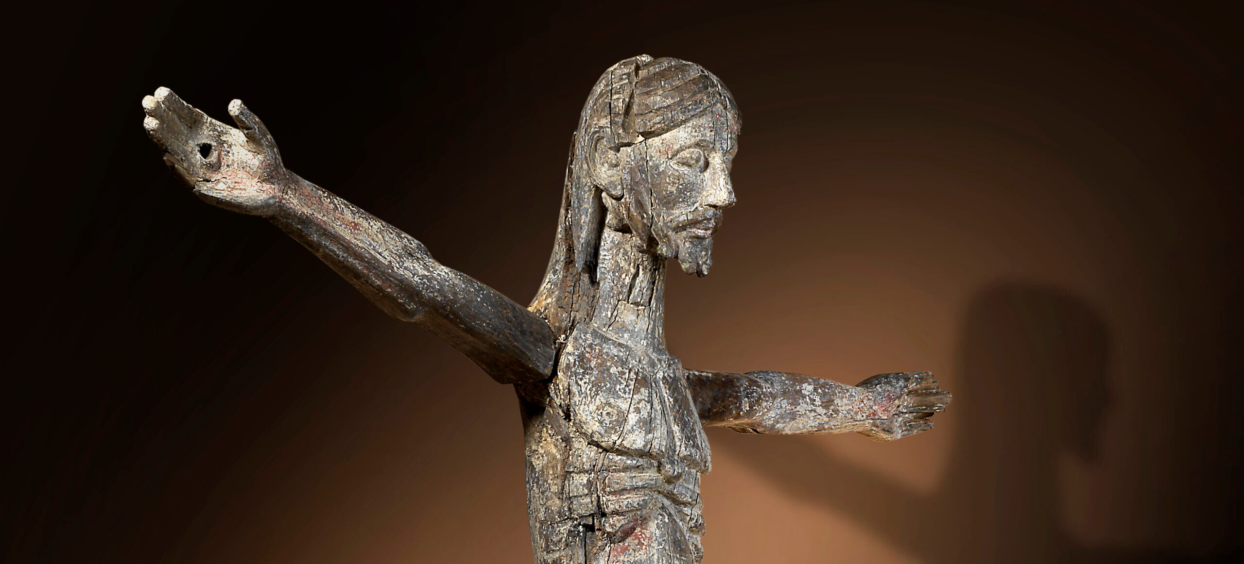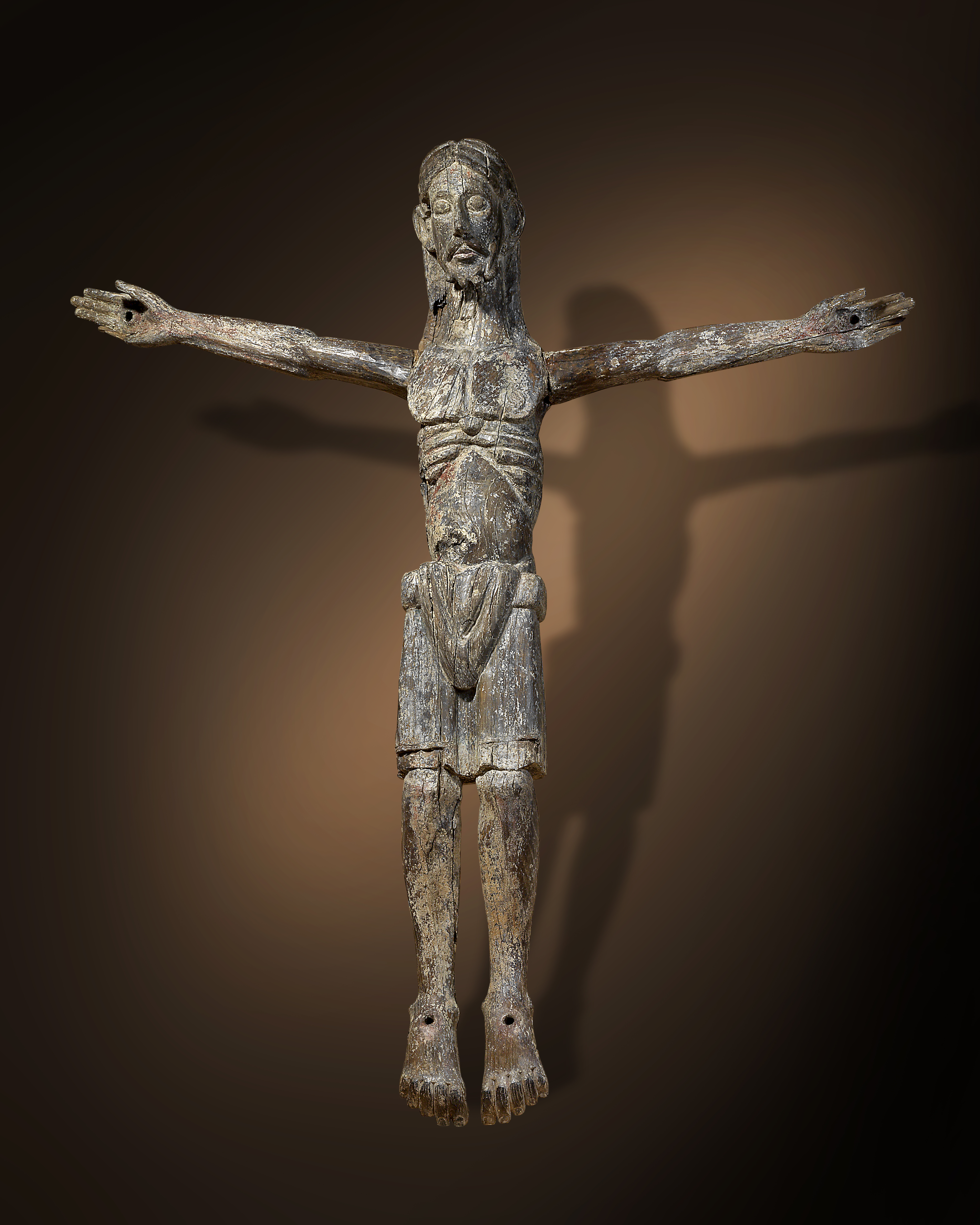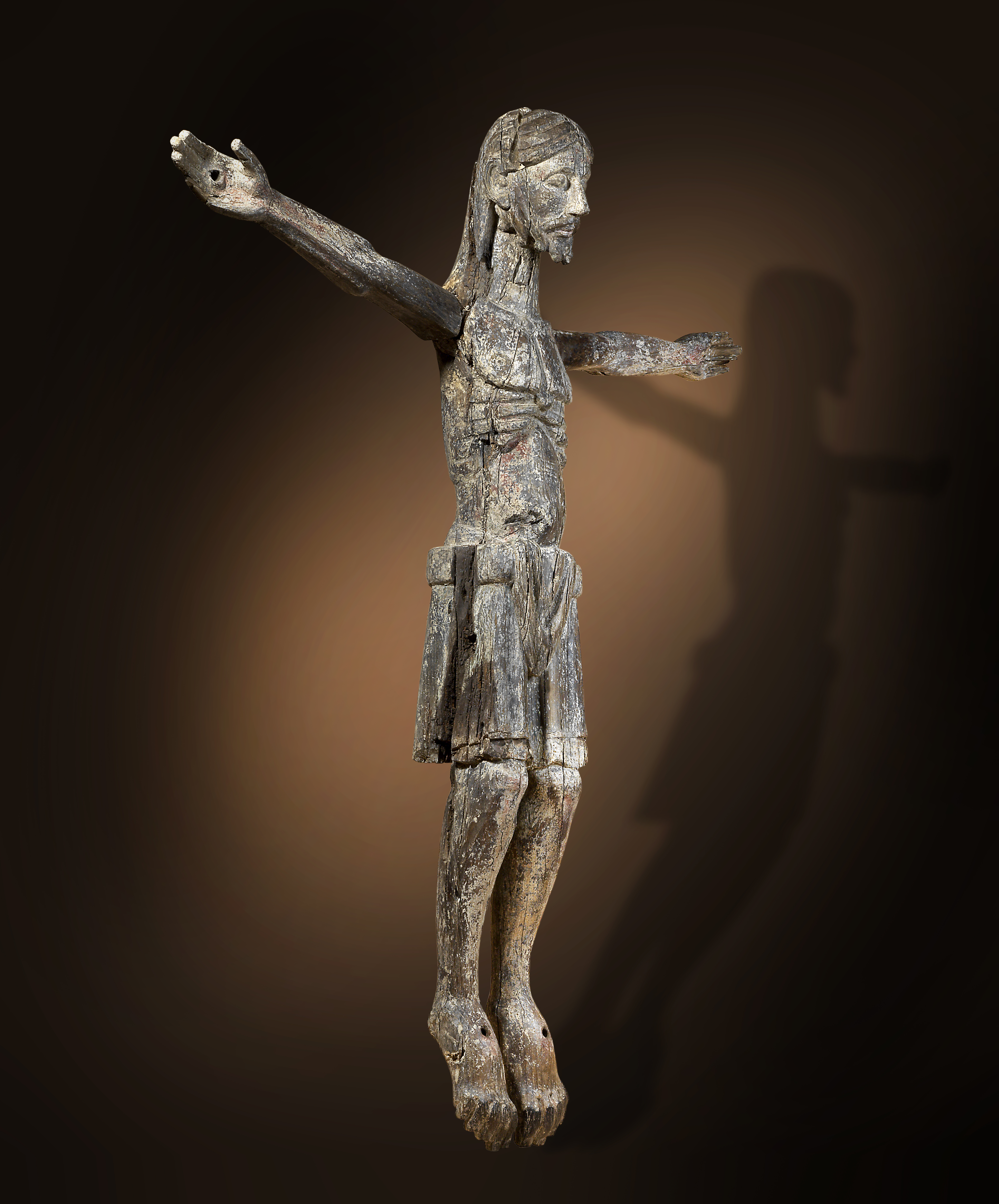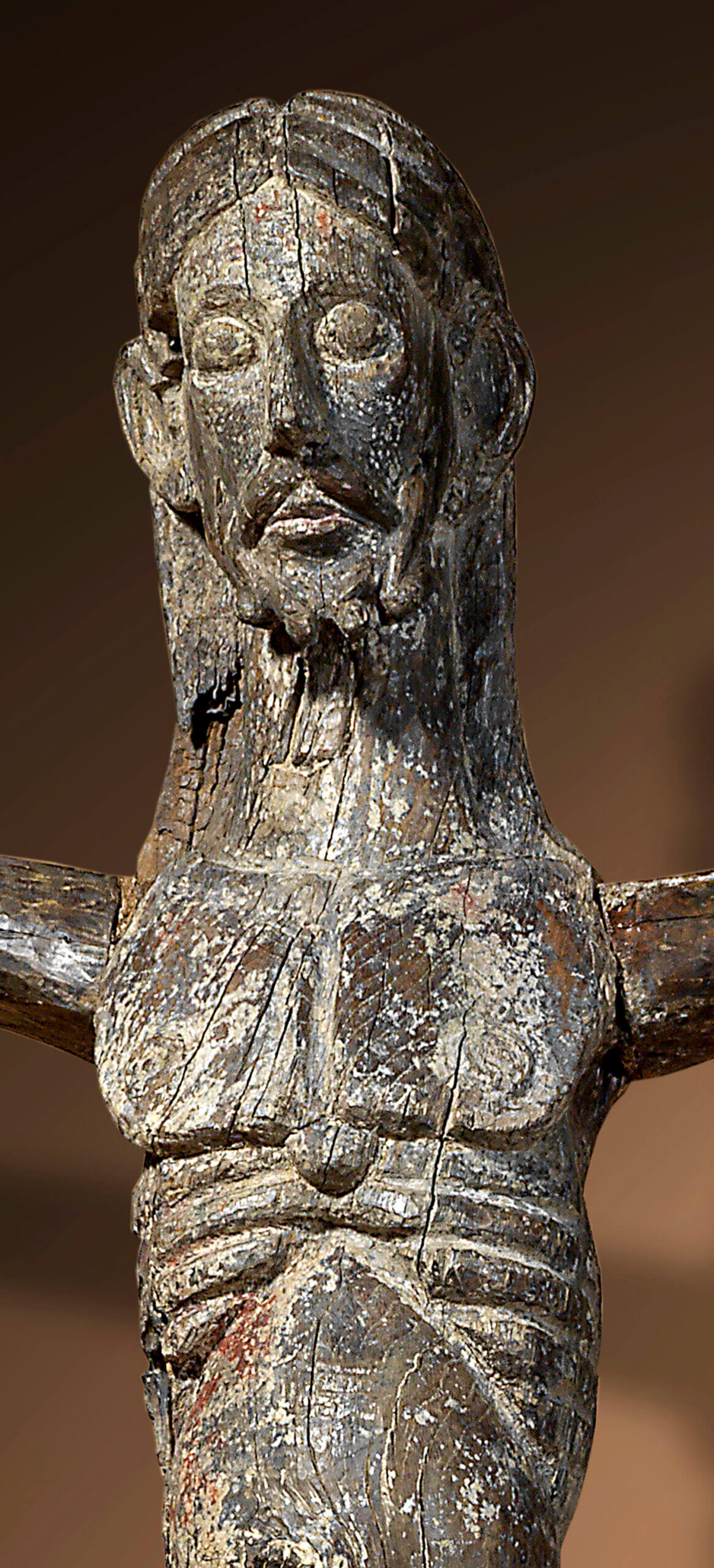 Obwohl dieses einzigartige, phänomenal erhaltene Kruzifix mit gemartertem Körper gezeigt wird, triumphiert Christus über den Tod, symbolisiert durch die leidend-idealisierte Repräsentation in majestätisch-gerader Haltung mit weit geöffneten Augen.