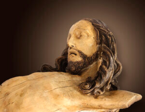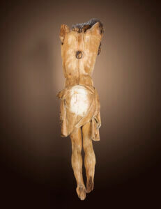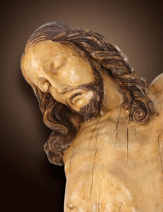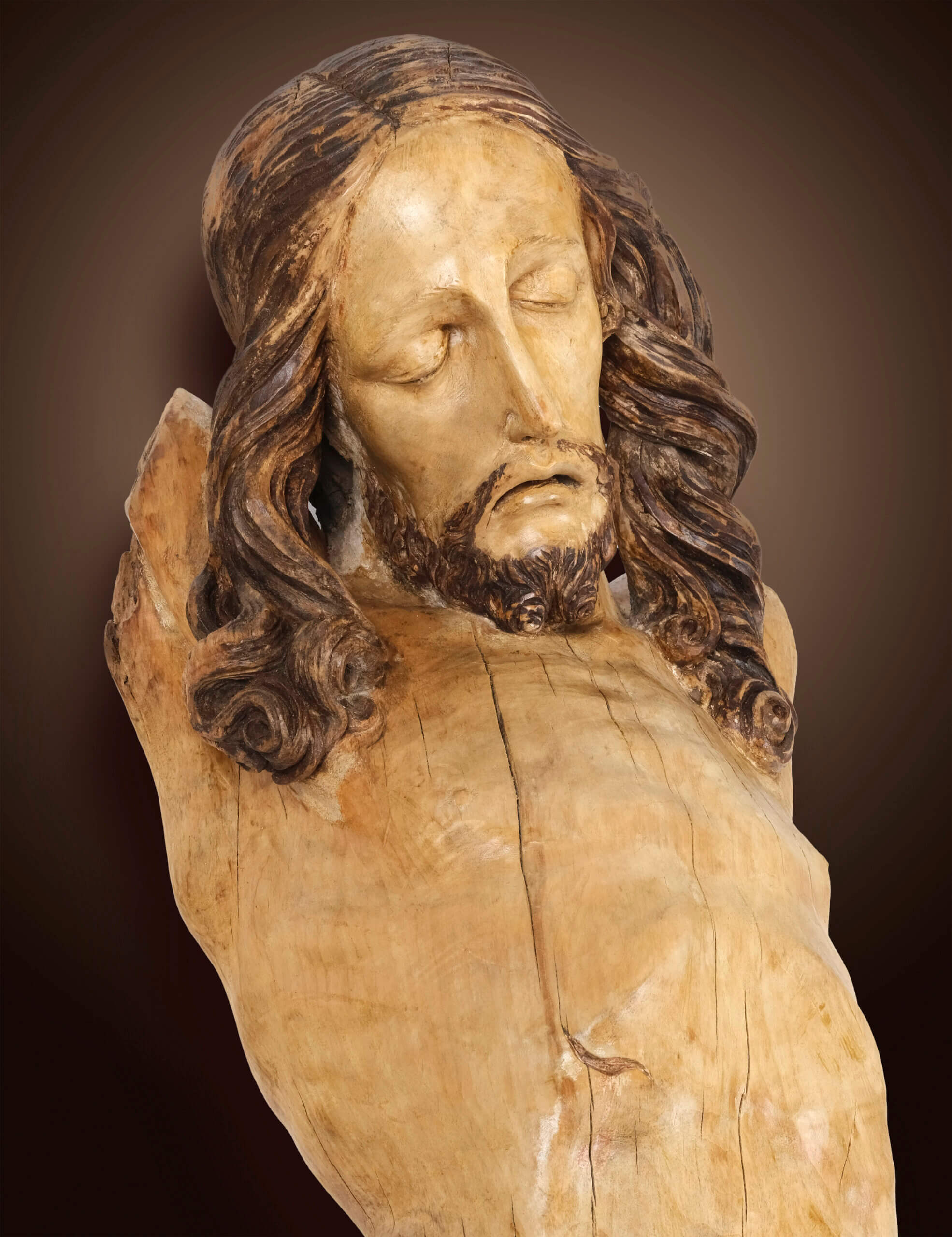 In seinem „Sack“- artig herabhängenden Corpus dessen kraft des linken Schulter-Ansatzes die Arme ursprünglich in schräg ansteigender Pose vorzustellen sind und bei dem außerdem die Füße fehlen, besticht vor allem die in ihren plastischen Oberflächen enthaltene subtile formale Interpretation des Inkarnats und der geriffelten Artikulierung der Haarsträhnen, die seitlich in großformigen Wellen gleichsam herabtriefend gegeben sind und –vor allem— im physiognomischen Ausdruck, in dem der zuvor inhaltlich überstandene Schmerz scheinbar zu einer erstarrenden Ruhe gekommen ist. Im auffälligen Kontrast zur betont vertikalen Haltung des Corpus, dessen Axialität durch die sanfte Neigung des Oberkörpers nach links zu und im Akkord mit den parallel gelagerten Beinen eine spannungsintensive Nuance erfährt ergibt das nach links geneigte Haupt in seinem intensiven Gesichtsausdruck in der markant nach vorne geneigten Pose eine trotz des inhaltlichen „erstorben Seins“ betont vitale und zugleich expressive Komponente in der skulpturalen Realisierung. Just diese artikulierte Neigung des Haupts verleiht dieses Skulptur im Zusammenhang mit der anatomisch exakten Wiedergabe des Brustkorbs, sowie der Muskulatur bei den parallel gelagerten Knien jenen ausdruckstarken Spannungskoeffizienten, der diesen Kruzifixus im Vergleich zu zahlreichen thematisch übereinstimmenden geschnitzten Bildwerken seinen offensichtlichen „Sonderstatus“ verleiht. Zwischen den „anatomisch“ exakt wiedergebenen Partien im Brustkorb und bei den Beinen „vermittel“ das Lendentuch mit seinen spitz-parabolischen, abwärts drängenden Schüsselfalten und den an den Flanken der Hüfte herabhängenden Draperie-Endungen einen unruhigen Kontrast, wie ein solcher zu den lebhaften „Formen-Verdichtungen“ in den Haaren des Haupts korrespondierend wirkungsvoll ist. Sowohl bei letzteren, als auch bei ersteren sind übrigens die einzigen Zonen innerhalb dieser Skulptur, wo in unterschiedlichen Dimensionen Reste der vorauszusetzenden Polychromierung vorzufinden sind. Analog die „wogende“ Oberfläche am Brustkorb deutlich den Bereich von den Herz- und Lungen- Partien im Kontrast zur einsinkenden Magengrube differenziert –und der markant linear konturierte Lanzenstich just am rechten Knorpelbogen in seiner Eigenschaft des plötzlichen Erfolgtseins als wirkungsvoller Gegensatz zum „edel geglätteten“ Inkarnat gegeben ist–, so kulminiert diese gestalterische Methodik in der Physiognomie, wo die hohe „Kalotten“ artig gekurvte Stirne im Akkord mit den weit gekrümmten Augenbrauen in deren kontinuierlichen Übergang zu langen Nase in Abstimmung auf die tiefliegenden Augenhöhlen mit ihren fast ganz geschlossenen, in stereometrischer Rundung begriffenen Lidern, sowie in den „sphärisch gebogenen“ Wangen im durch den Bart separierten, nach oben gebogenen „Mondsichel“- artigen Mund den „zur Ruhe gelangten“ vorherig erlittenen Todesschmerz in einem verhaltenen Subsumieren ausdrückt.